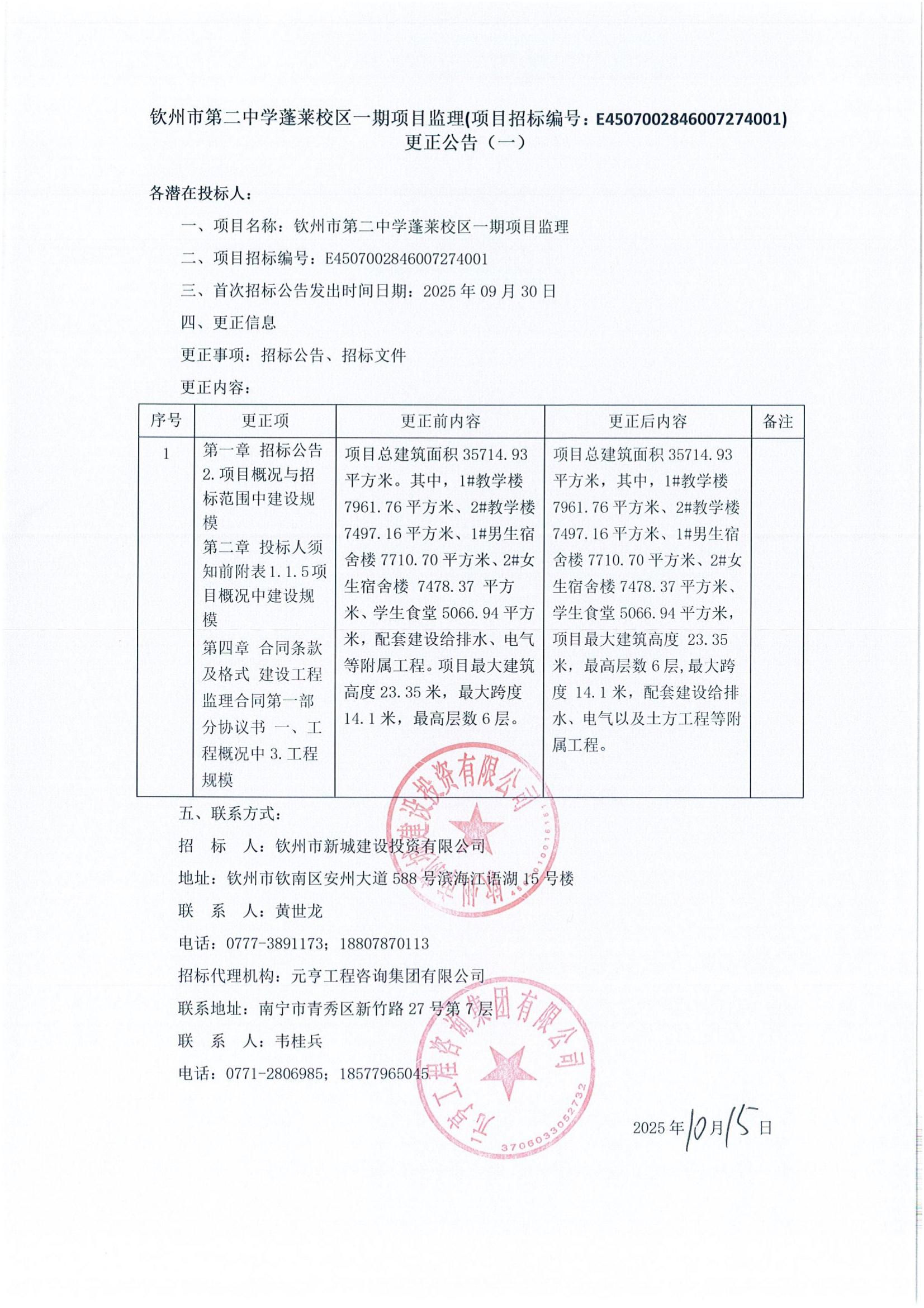 钦州市第二中学蓬莱校区一期项目监理(项目招标编号:E4507002846007274001)更正公告(一)