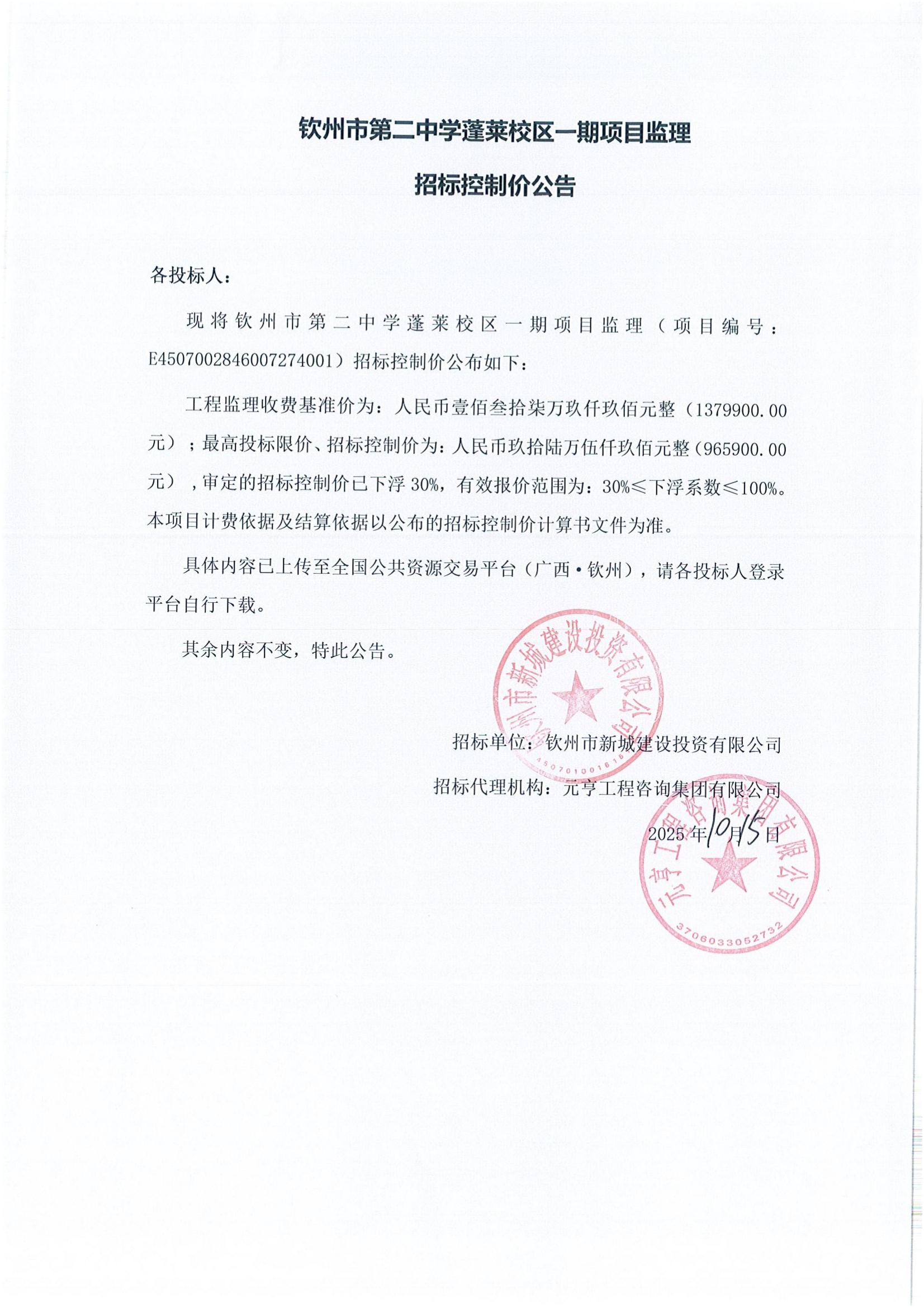 钦州市第二中学蓬莱校区一期项目监理招标控制价公告