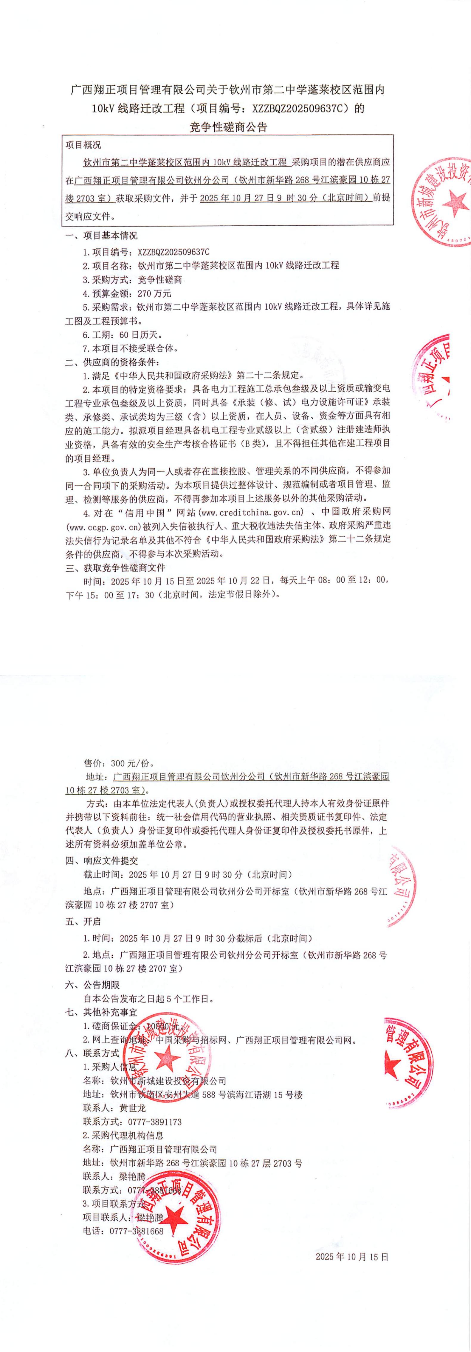 广西翔正项目管理有限公司关于钦州市第二中学蓬莱校区范围内10kV线路迁改工程(项目编号:XZZBQZ202509637C)的竞争性磋商公告