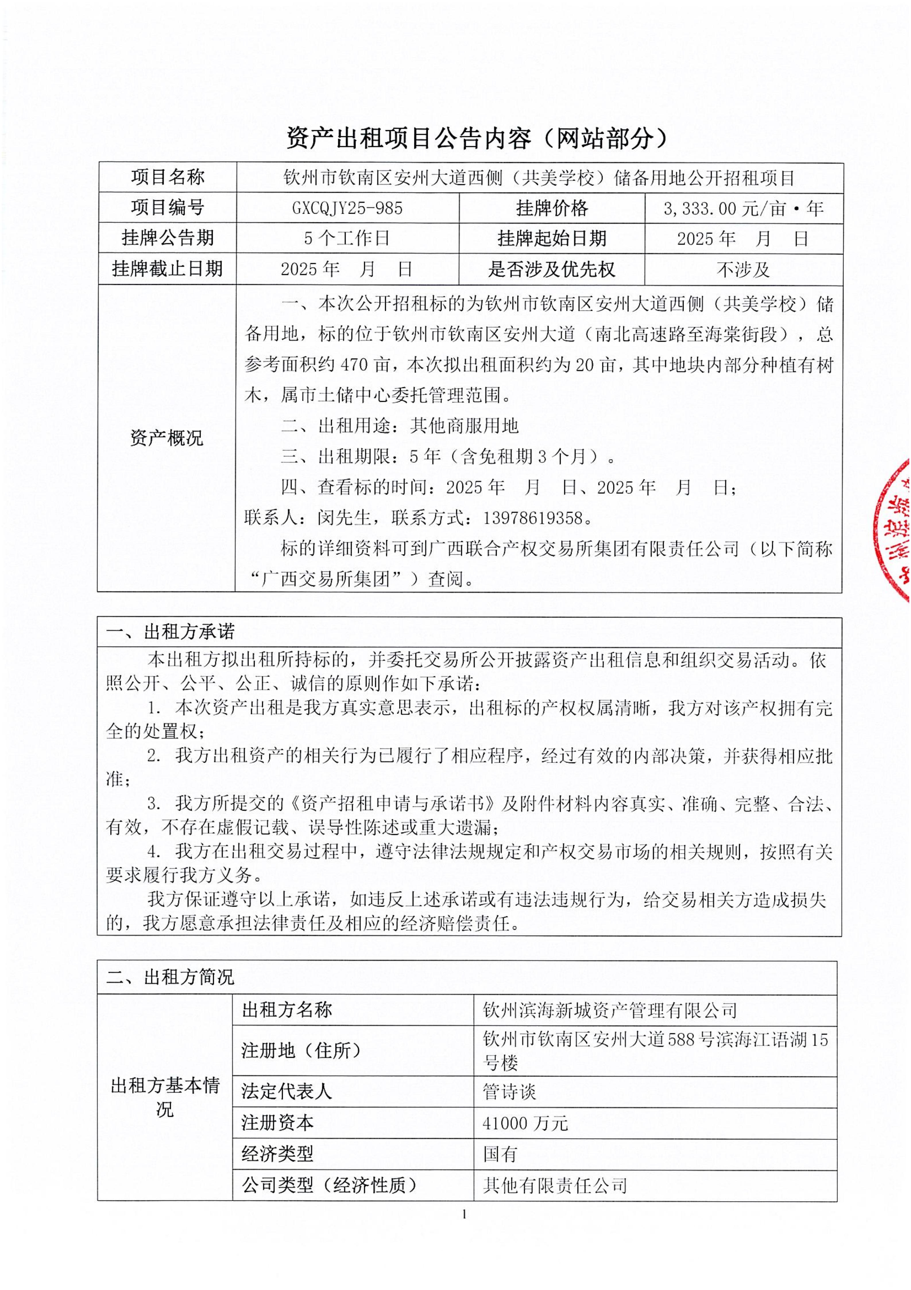 钦州市钦南区安州大道西侧(共美学校)储备用地公开招租项目