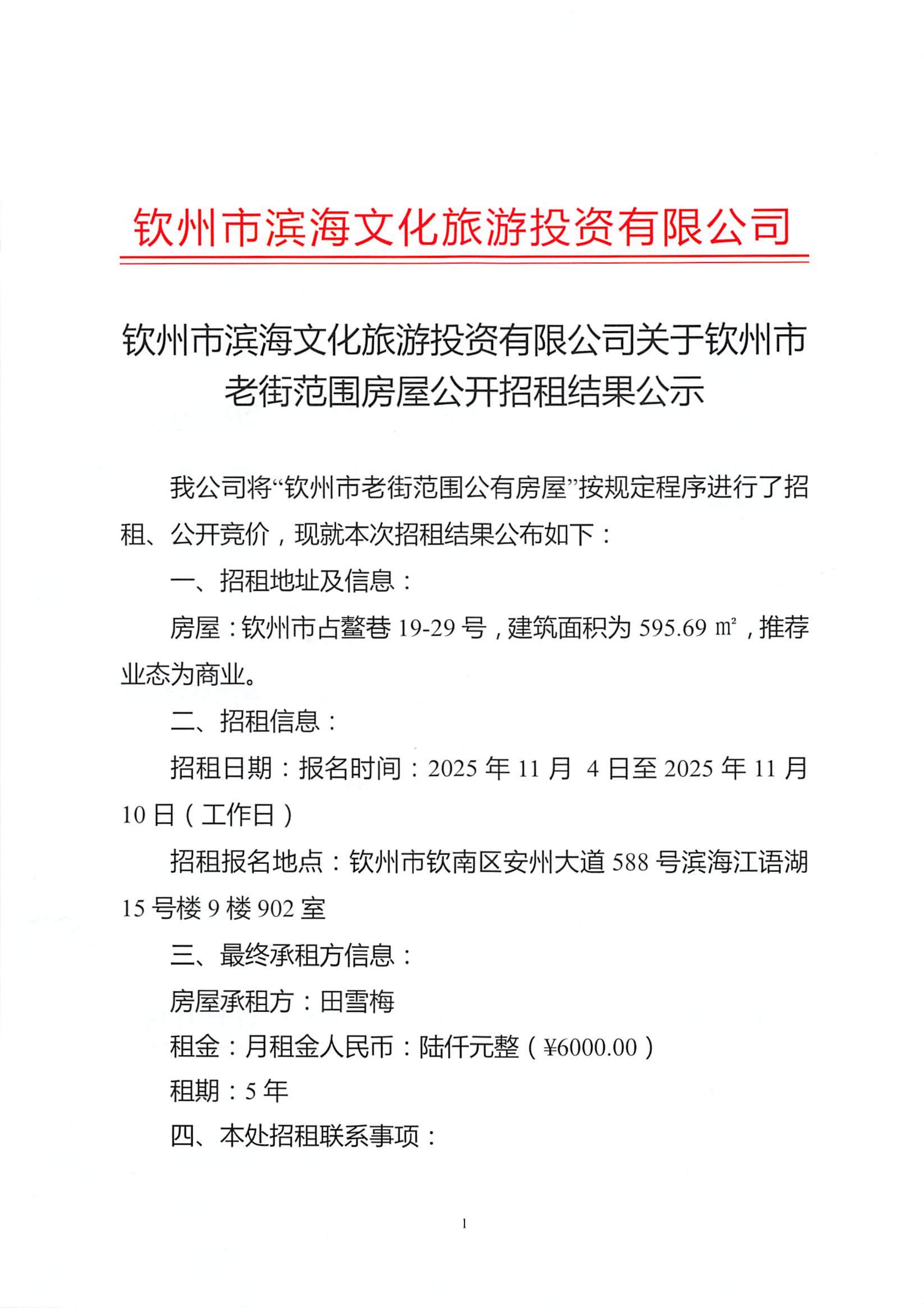 钦州市滨海文化旅游投资有限公司关于钦州市老街范围房屋公开招租结果公示(钦州市占鳌巷19-29号)