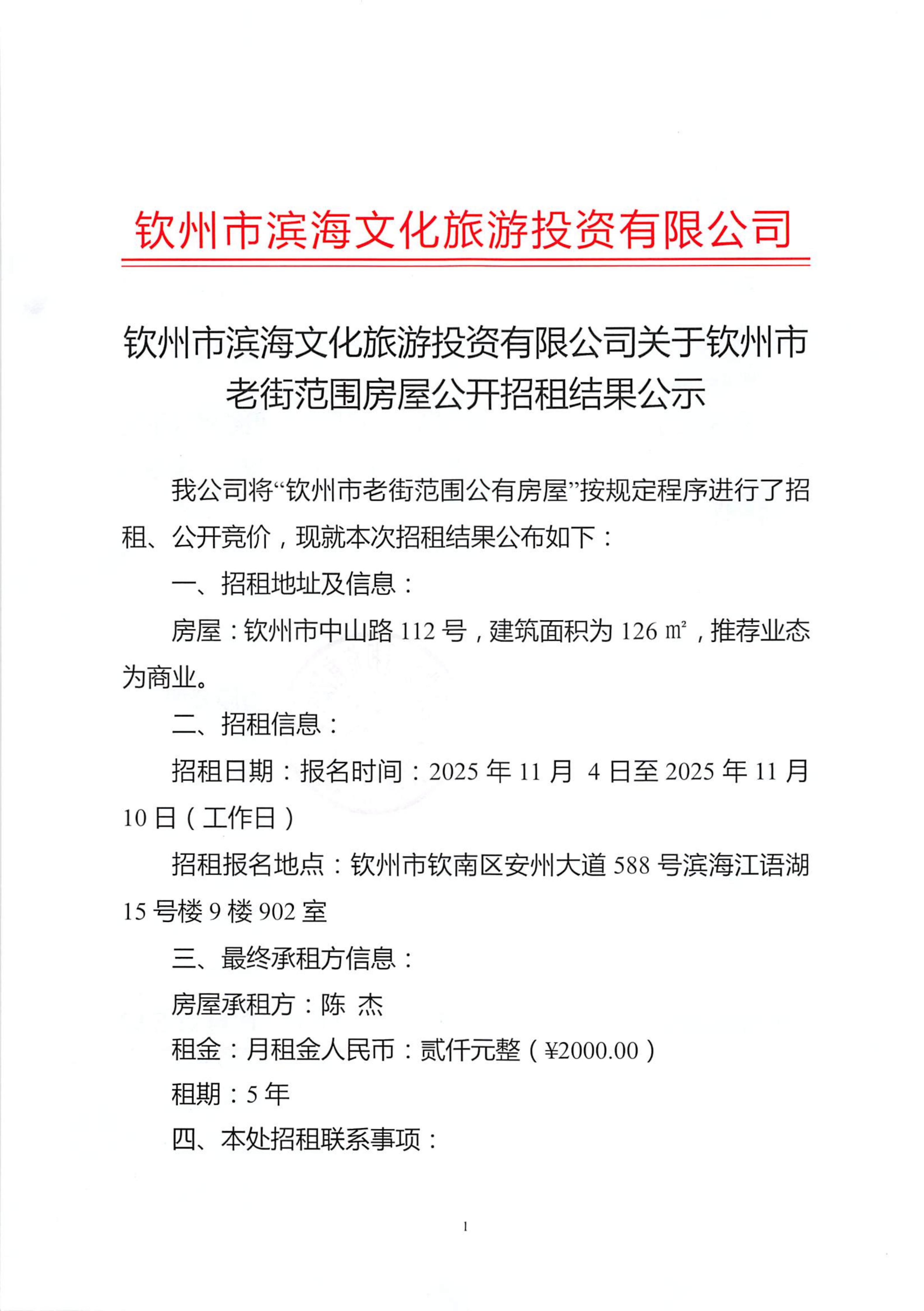 钦州市滨海文化旅游投资有限公司关于钦州市老街范围房屋公开招租结果公示(钦州市中山路112号)