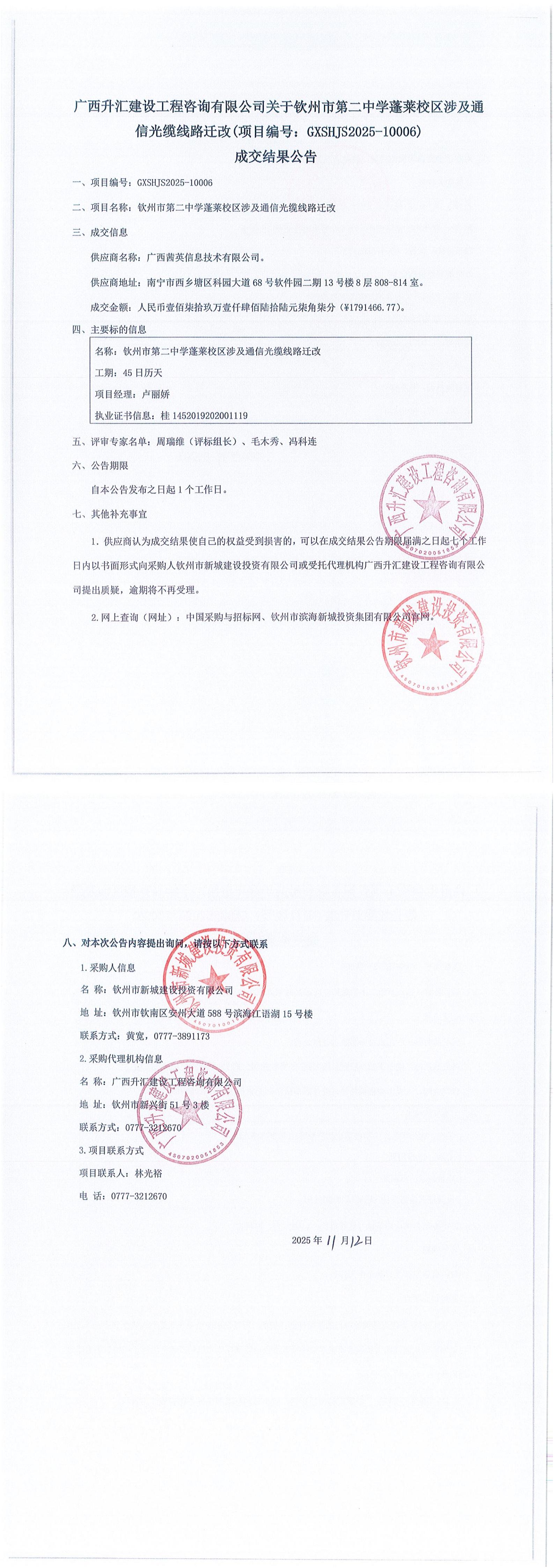 关于钦州市第二中学蓬莱校区涉及通信光缆线路迁改(项目编号:GXSHJS2025-10006) 成交结果公告
