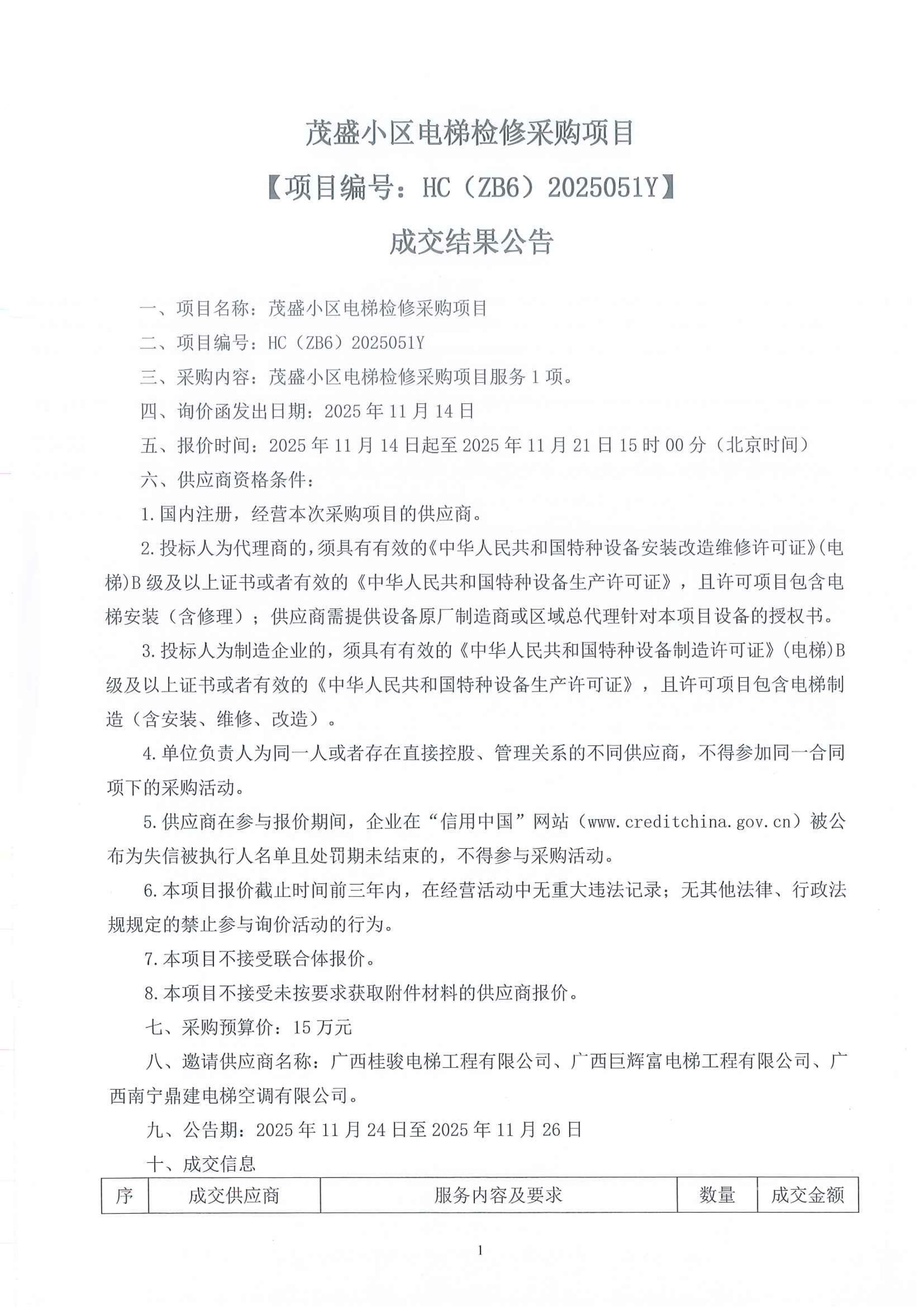 茂盛小区电梯检修采购项目【项目编号:HC(ZB6)2025051Y】 成交结果公告
