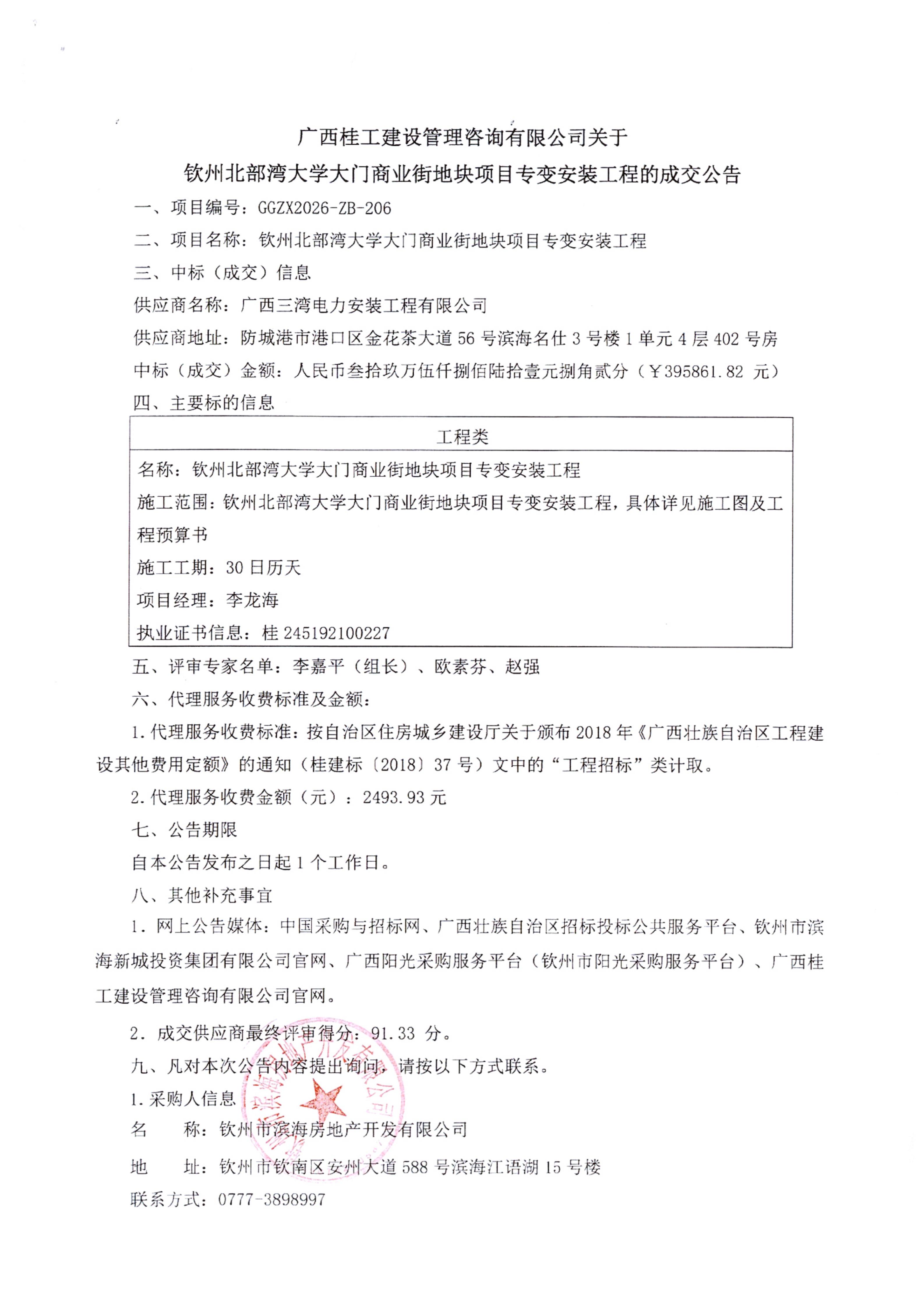 钦州北部湾大学大门商业街地块项目专变安装工程成交公告