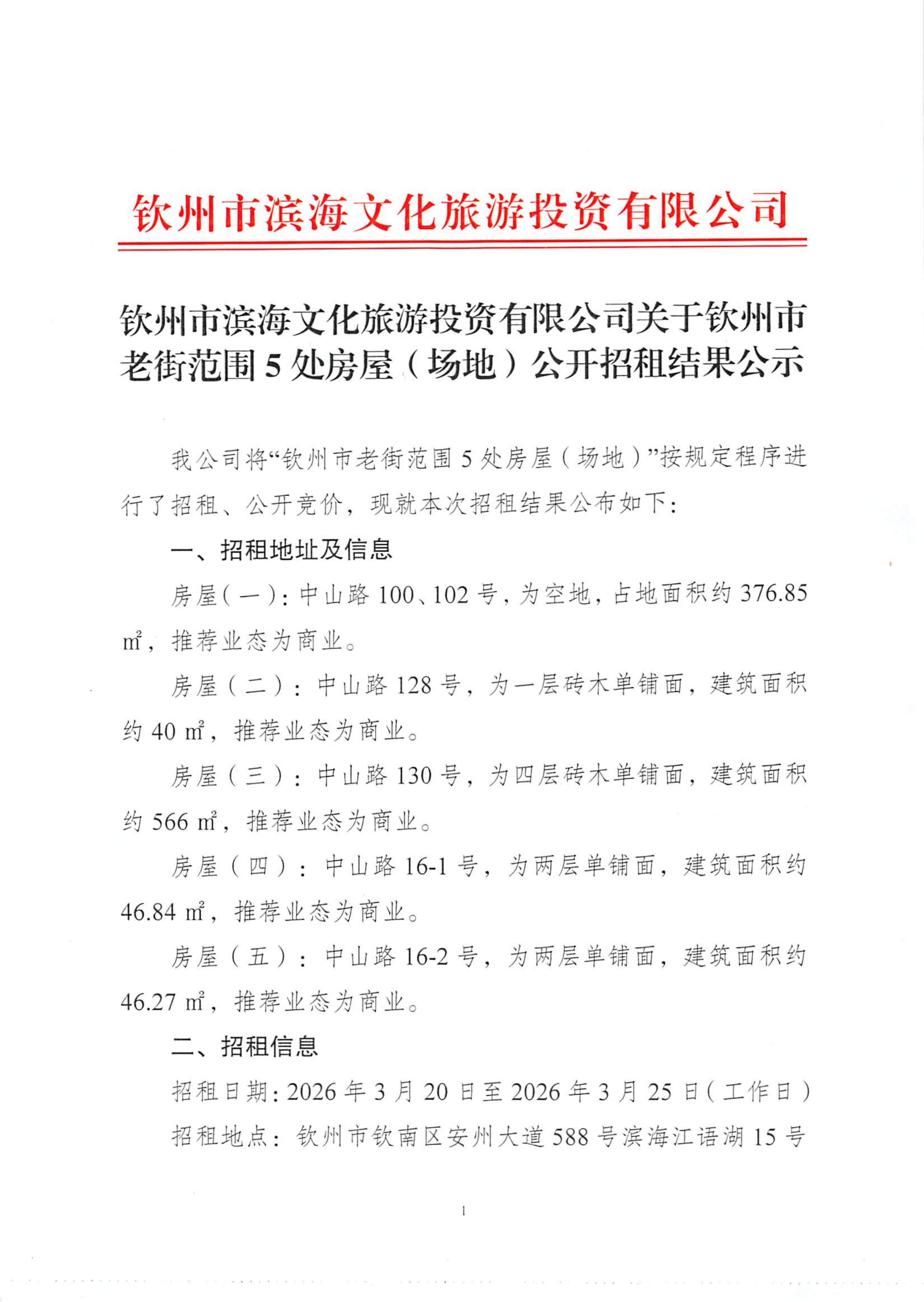 钦州市滨海文化旅游投资有限公司关于钦州市老街范围5处房屋(场地)公开招租结果公示