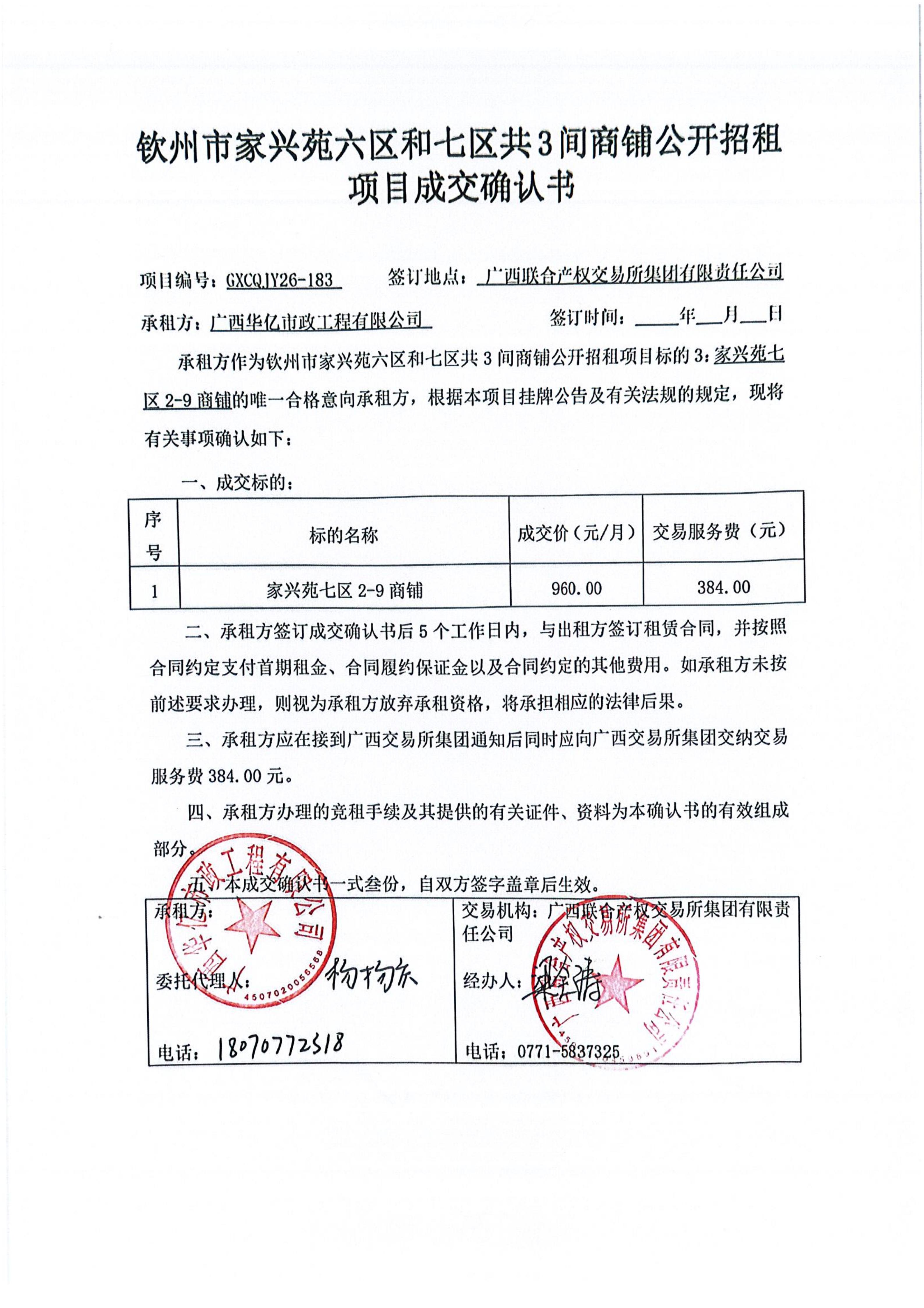 钦州市家兴苑六区和七区共3间商铺公开招租项目成交确认书