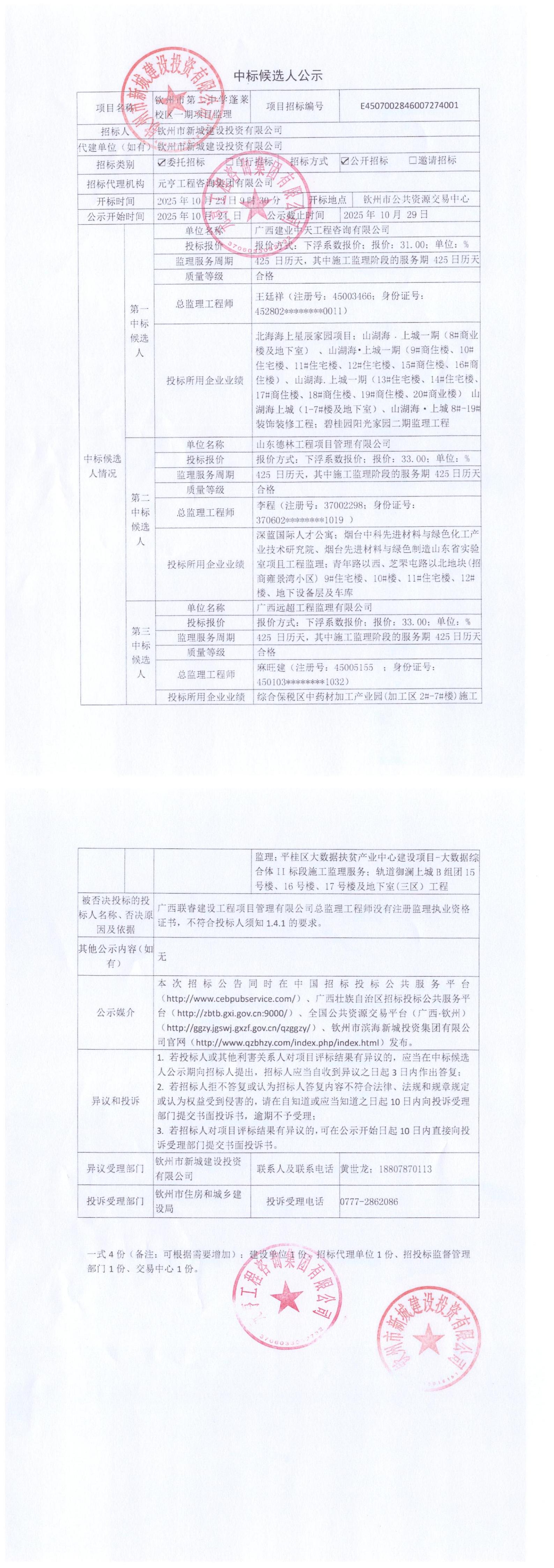 中标候选人公示(钦州市第二中学蓬莱校区一期项目监理)