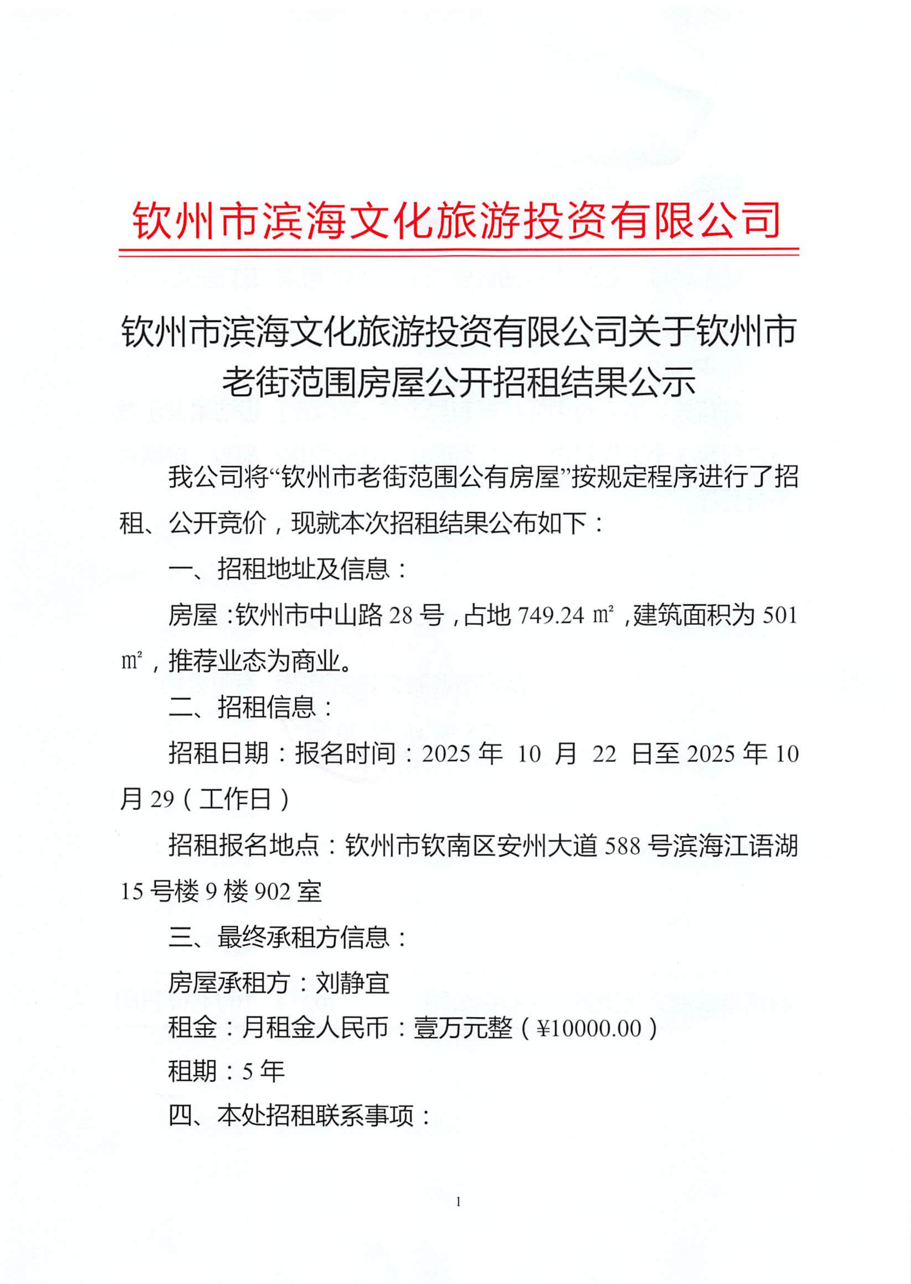 钦州市滨海文化旅游投资有限公司关于钦州市老街范围房屋公开招租结果公示