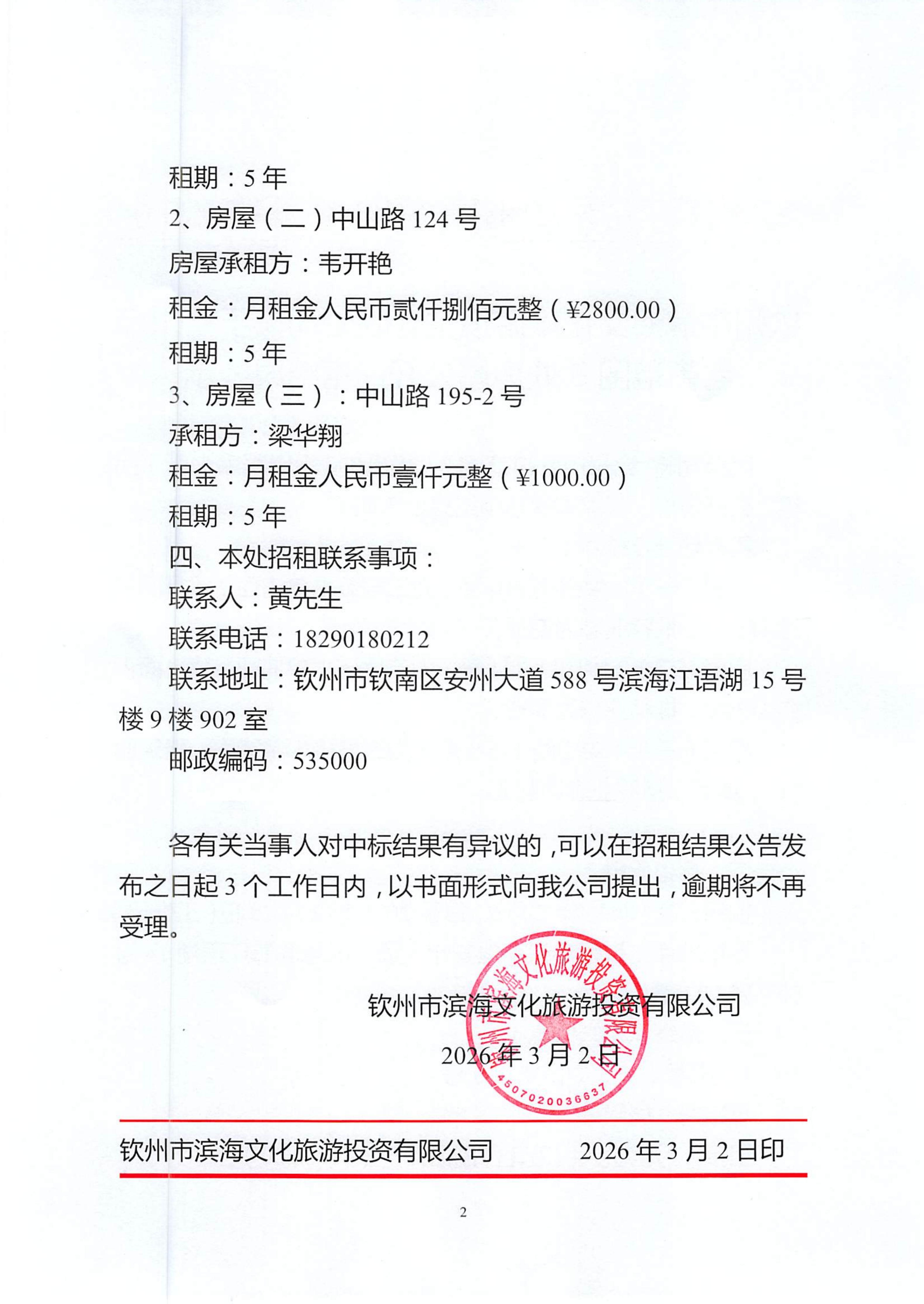 钦州市滨海文化旅游投资有限公司关于钦州市老街范围3处房屋公开招租结果公示