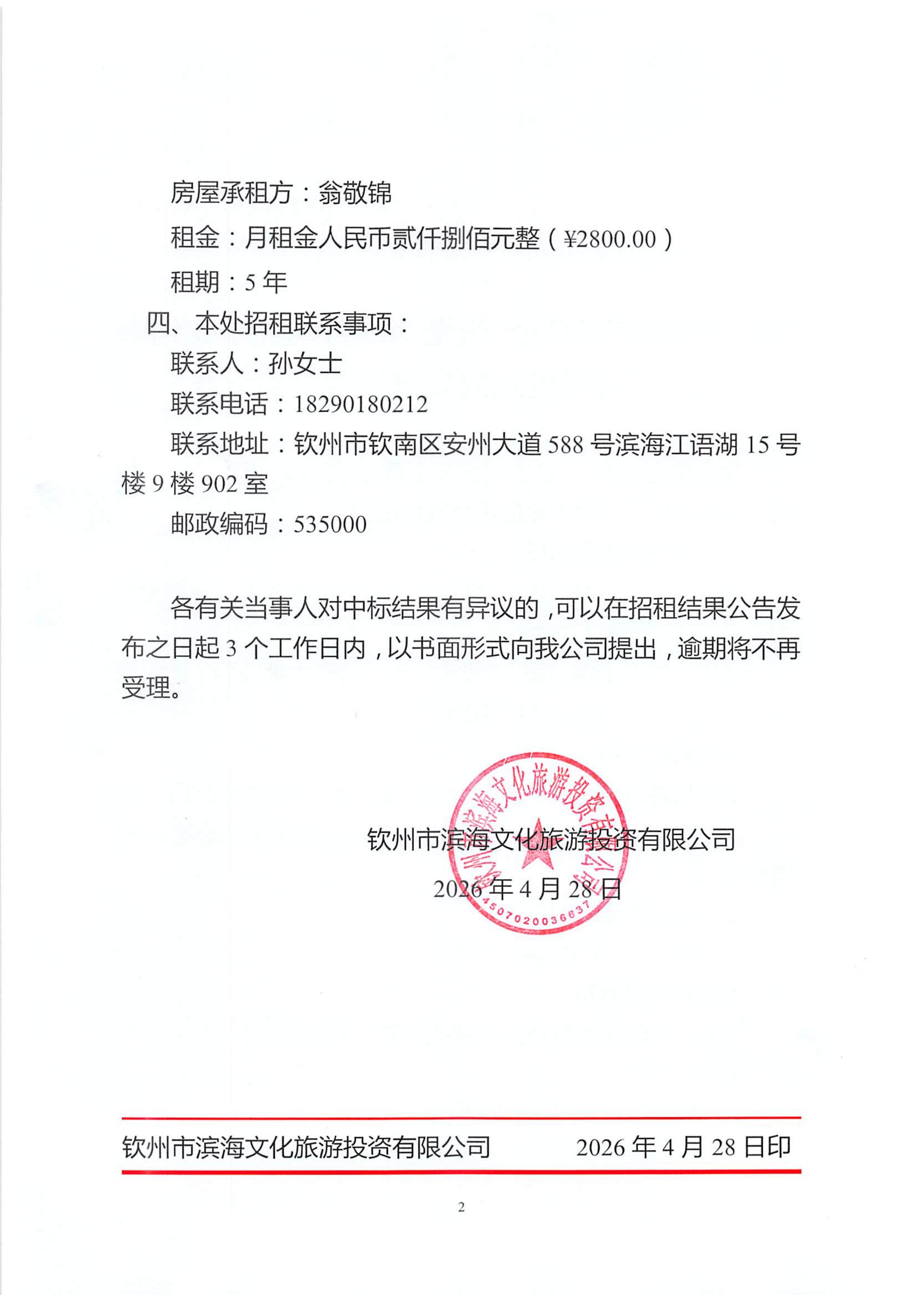 钦州市滨海文化旅游投资有限公司关于钦州市老街范围两处房屋公开招租结果公示