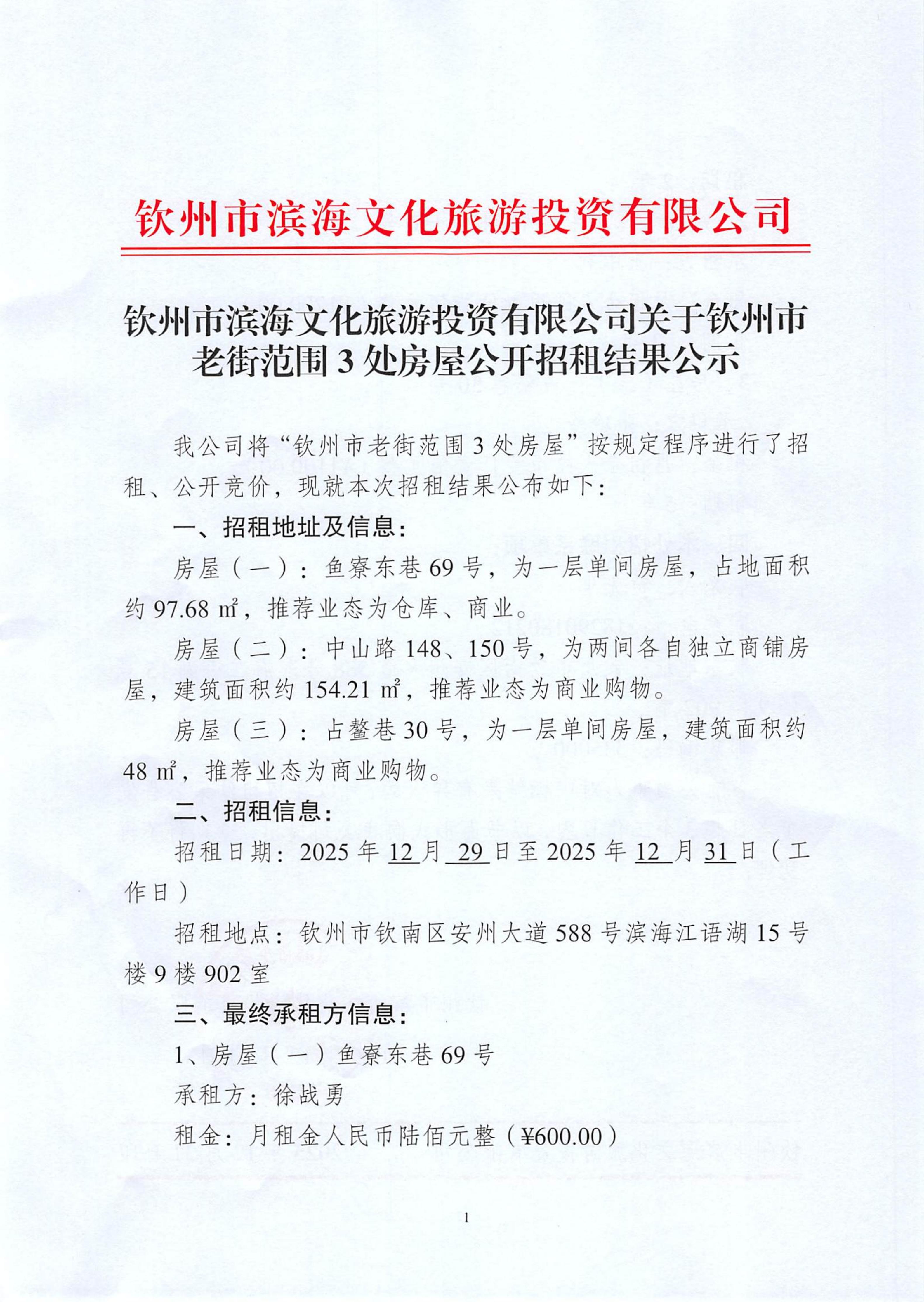 钦州市滨海文化旅游投资有限公司关于钦州市老街范围3处房屋公开招租结果公示