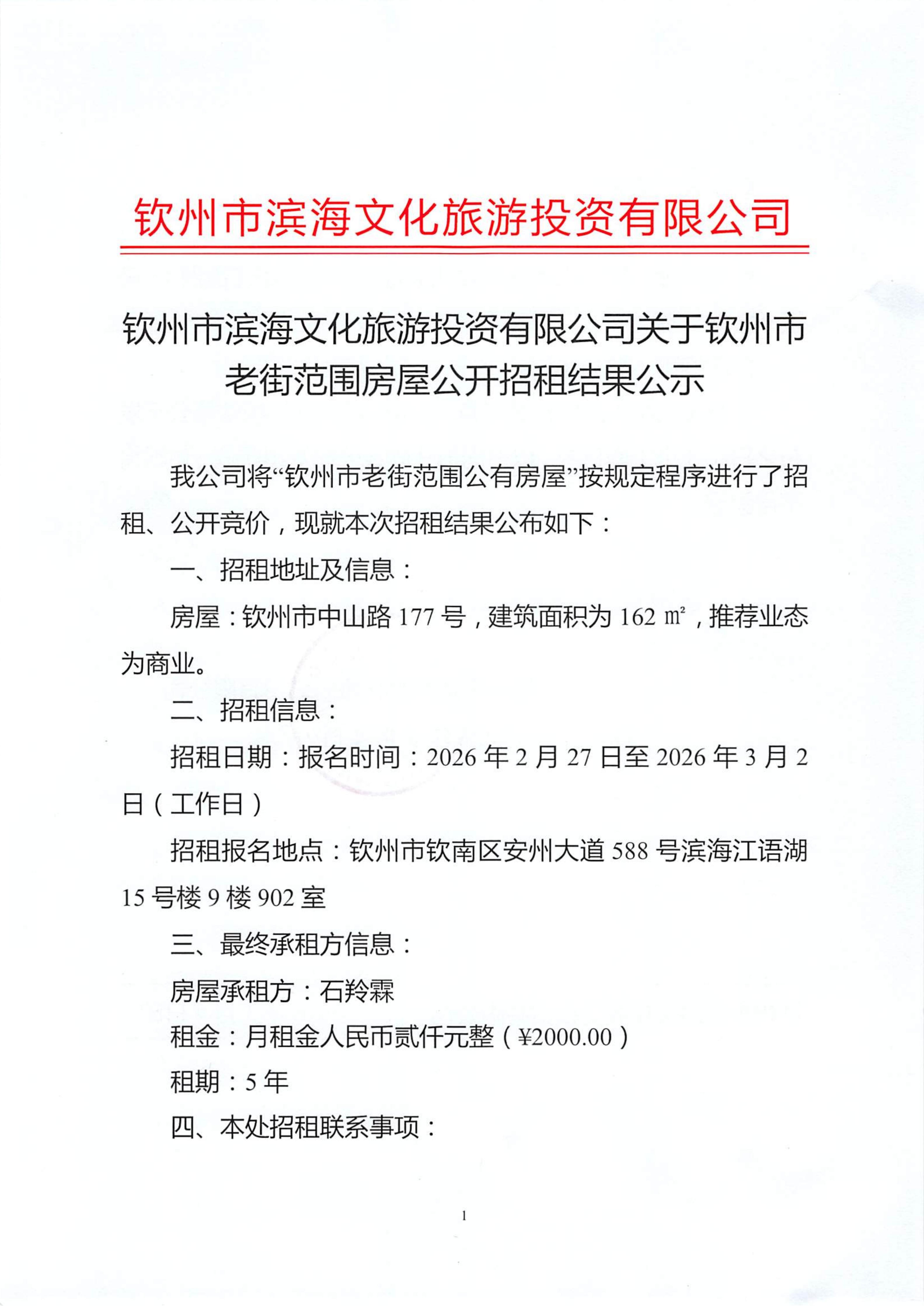 钦州市滨海文化旅游投资有限公司关于钦州市老街范围房屋公开招租结果公示
