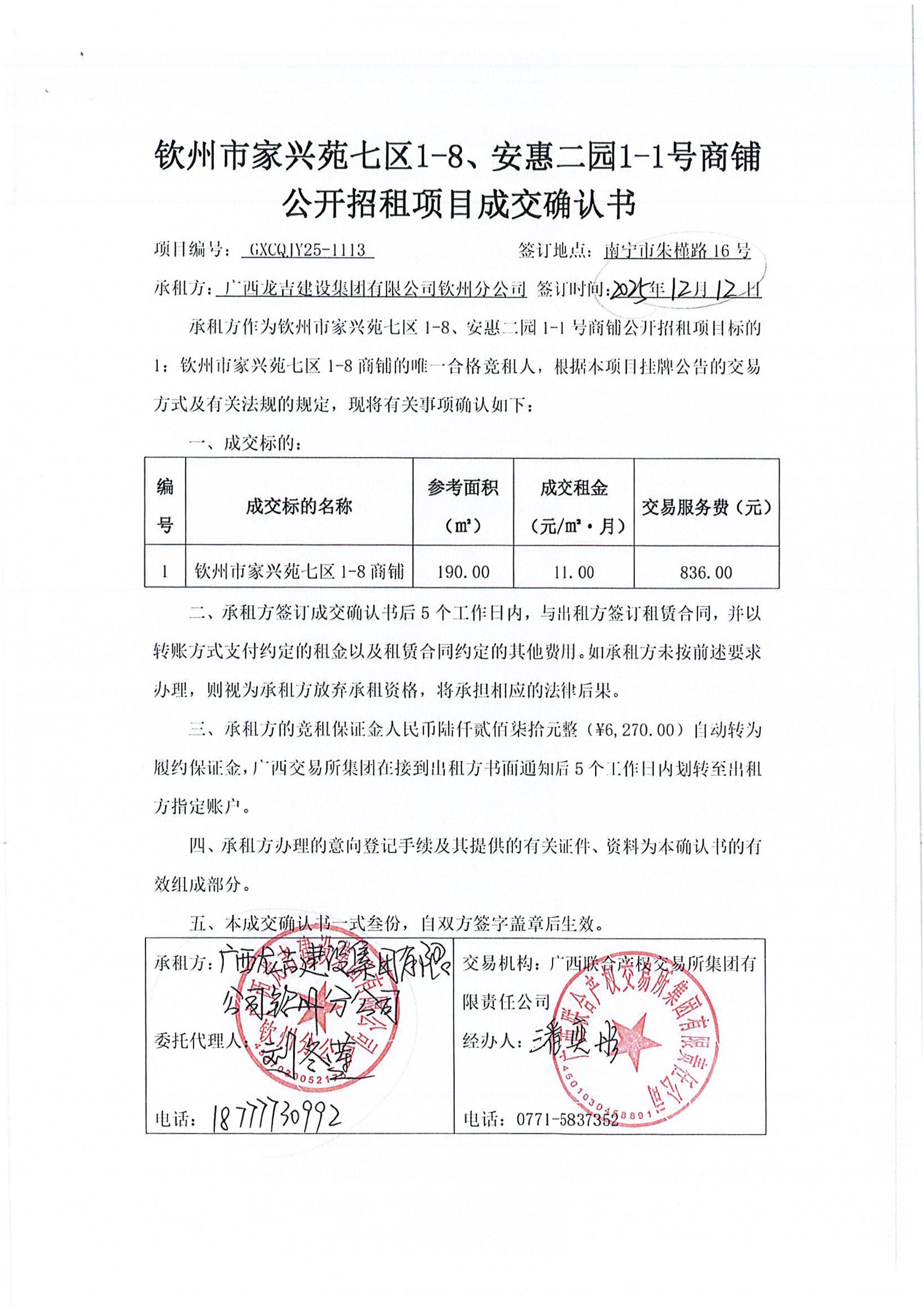 钦州市家兴苑七区1-8、安惠二园1-1号商铺 公开招租项目成交确认书