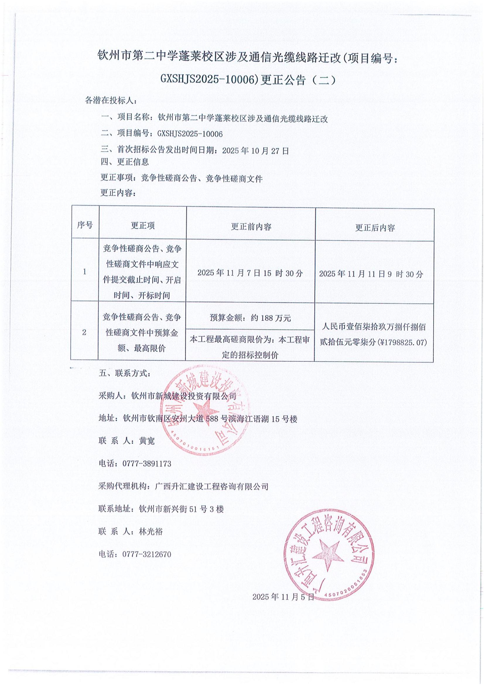 钦州市第二中学蓬莱校区涉及通信光缆线路迁改(项目编号: GXSHJS2025-10006)更正公告(二)
