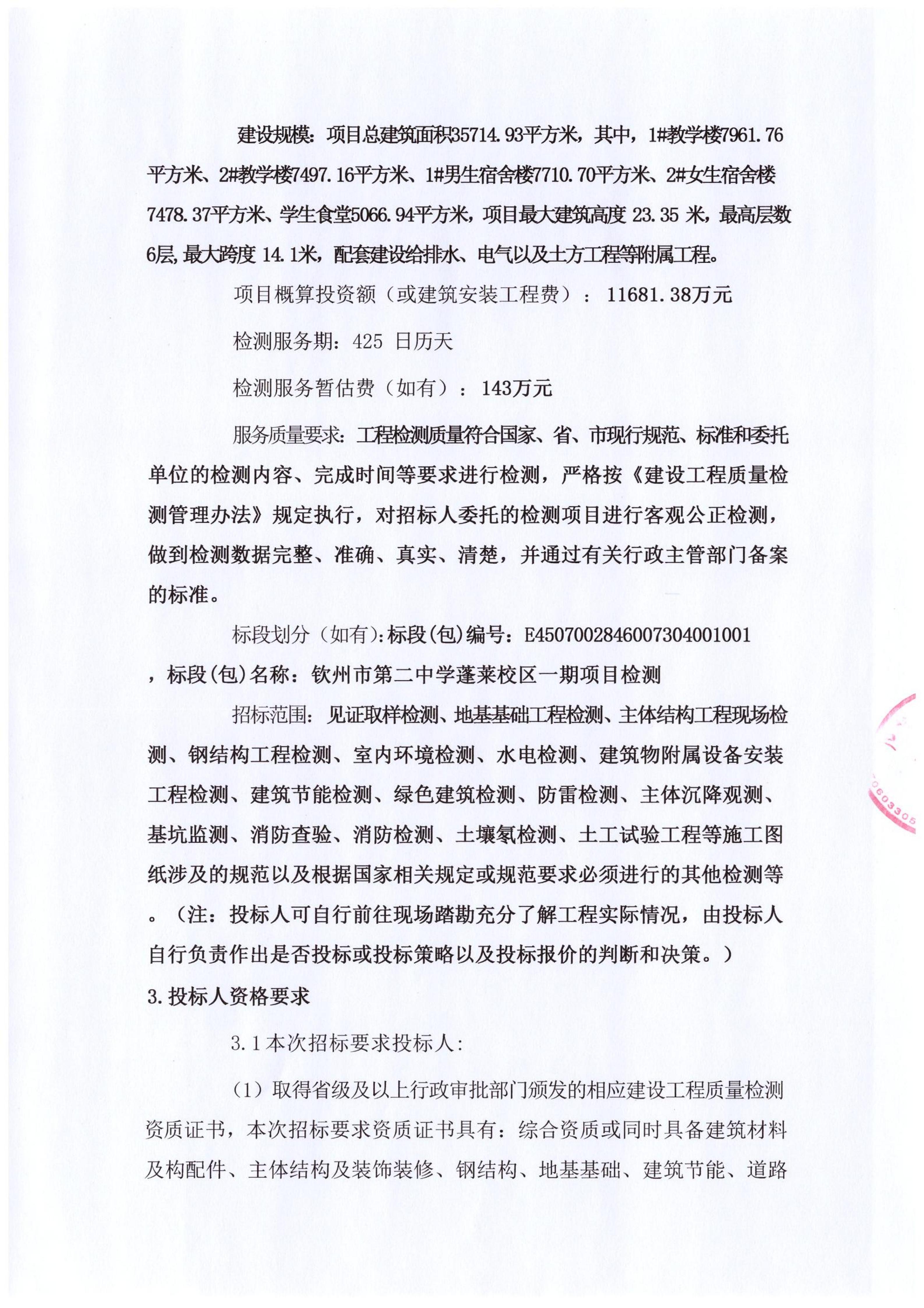 钦州市第二中学蓬莱校区一期项目检测工程检测招标公告