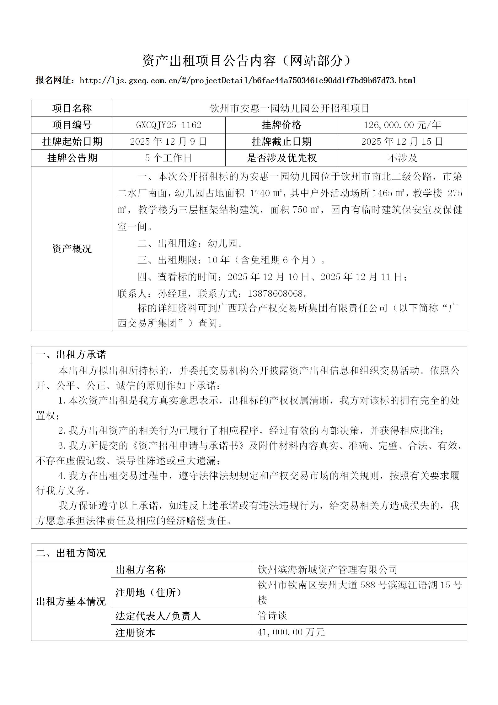 钦州市安惠一园幼儿园资产出租项目公告内容(公共资源)