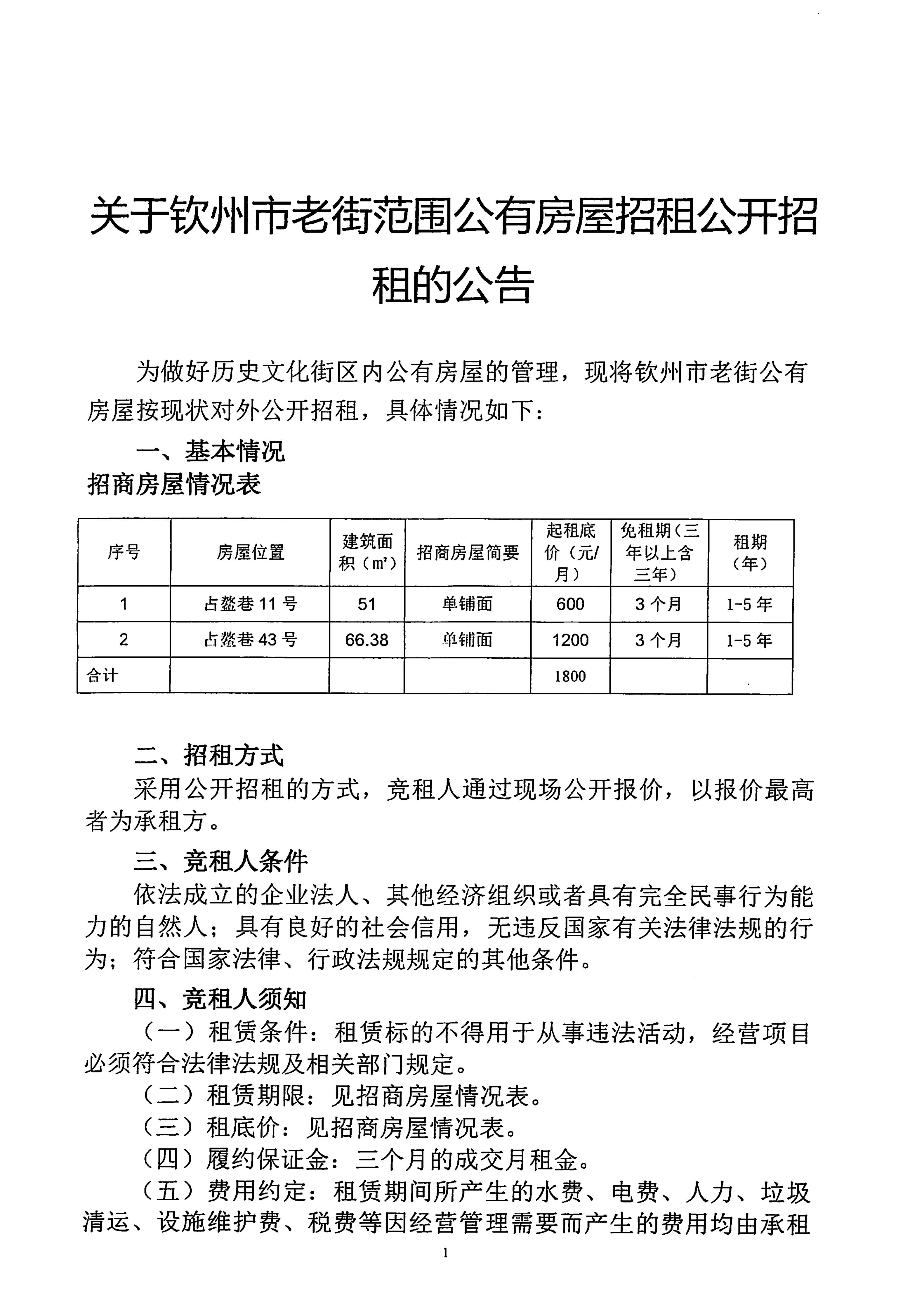 钦州市老街范围公有房屋公开招租的公告(占鳌巷11号、占鳌巷43号)