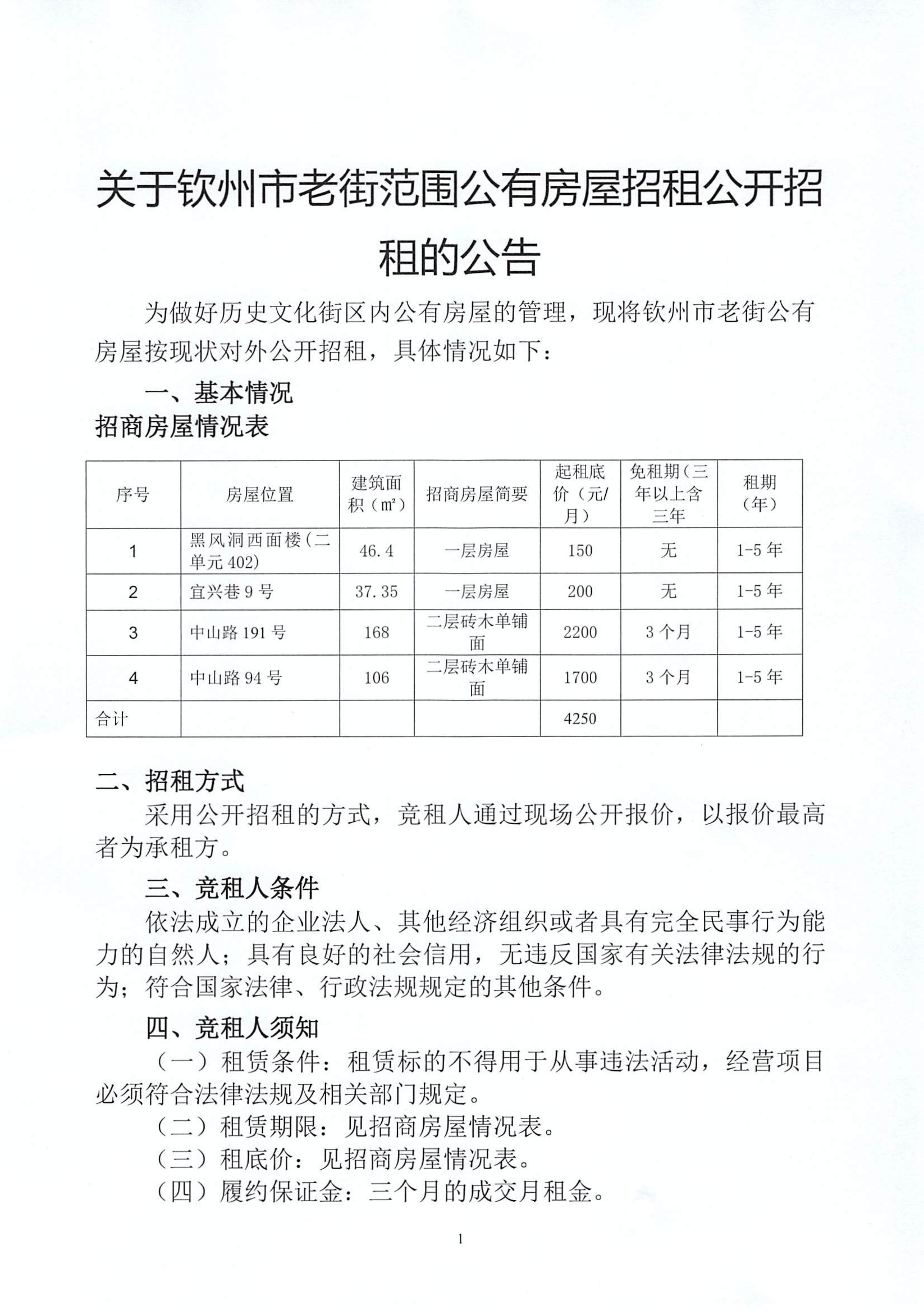 关于钦州市老街范围公有房屋招租公开招租的公告