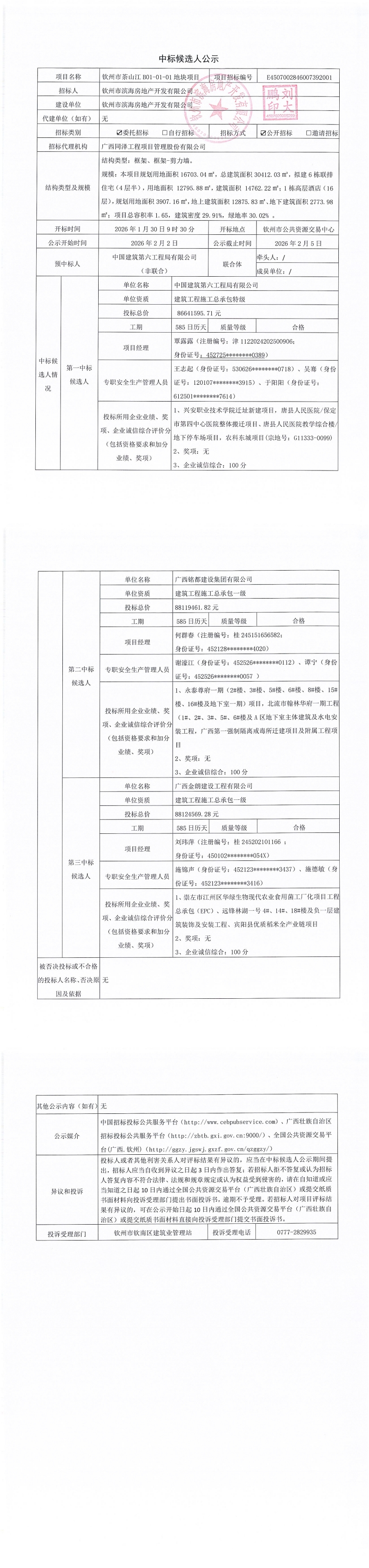 钦州市茶山江B01-01-01地块项目中标候选人公示