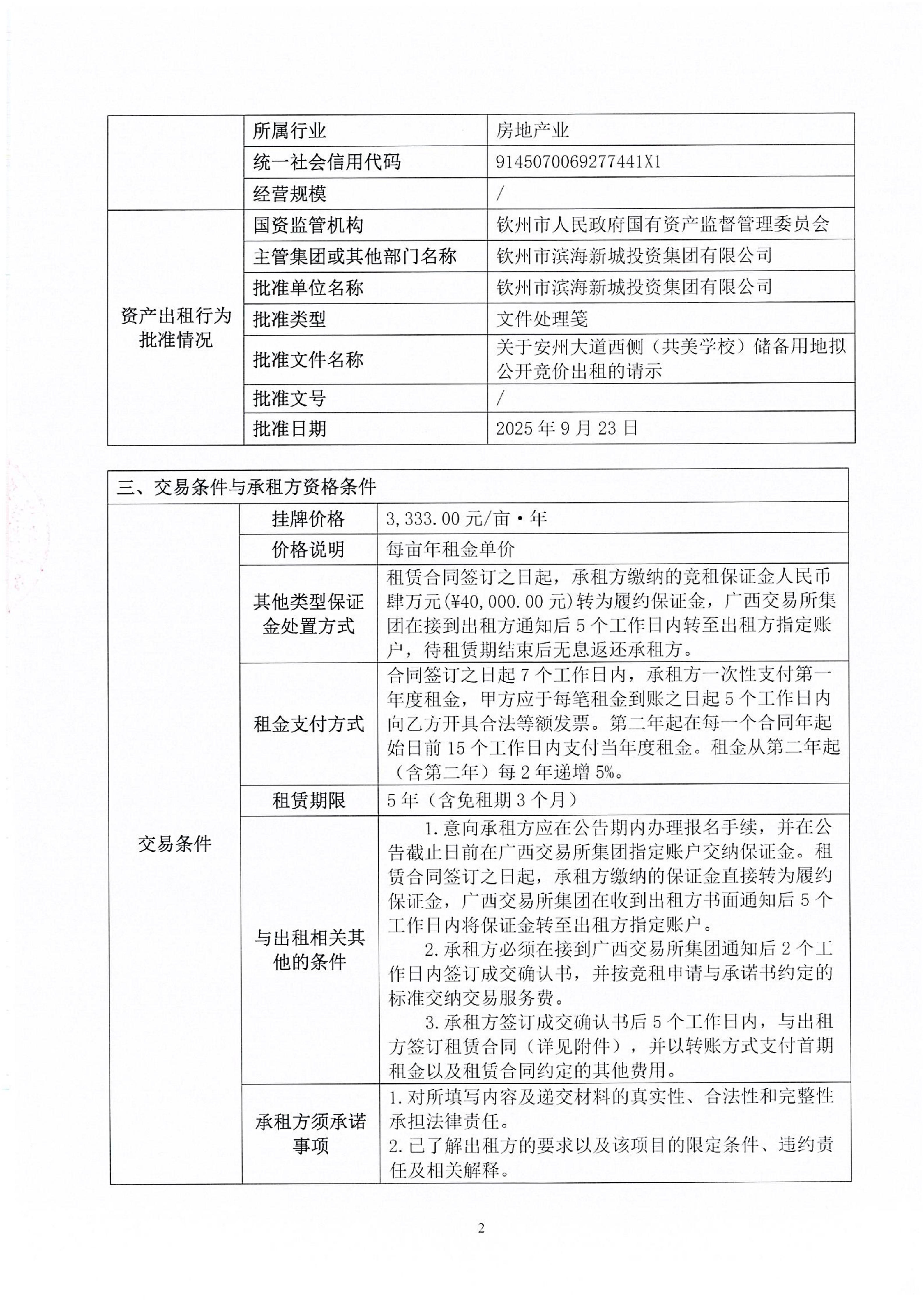 钦州市钦南区安州大道西侧(共美学校)储备用地公开招租项目