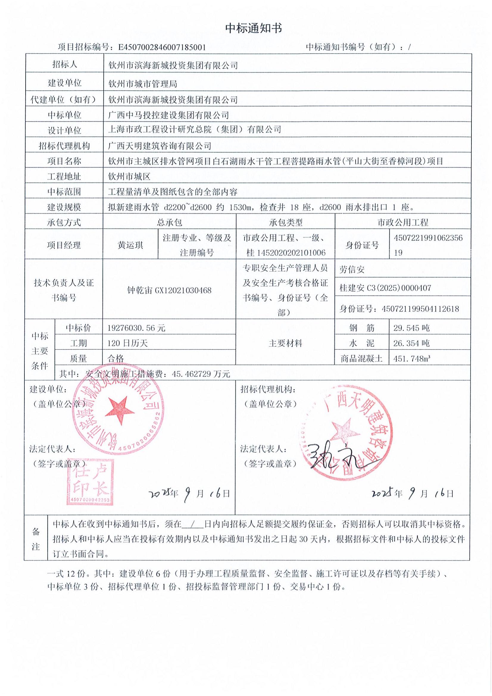 钦州市主城区排水管网项目白石湖雨水干管工程菩提路雨水管(平山大街至香樟河段)项目中标结果公示