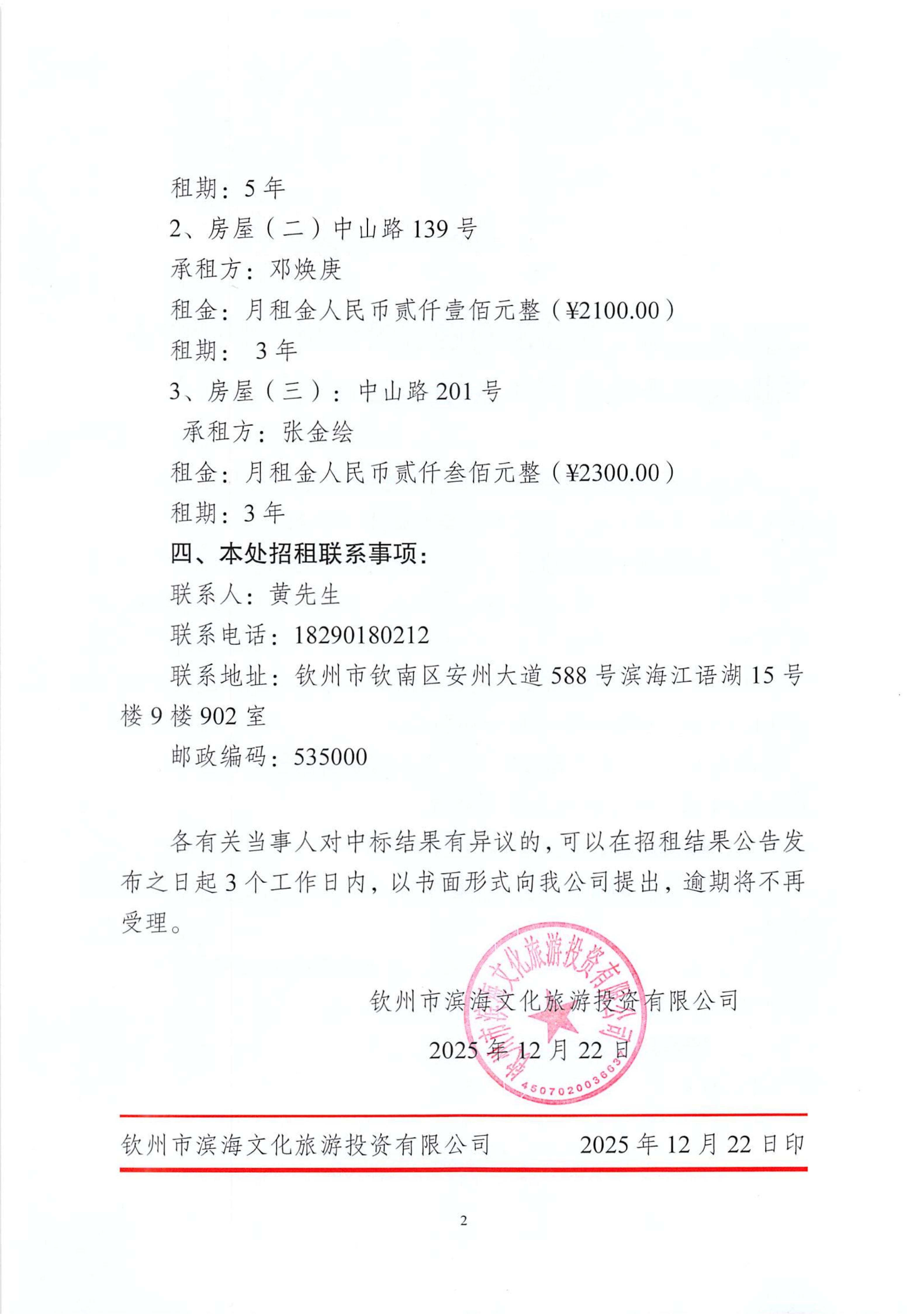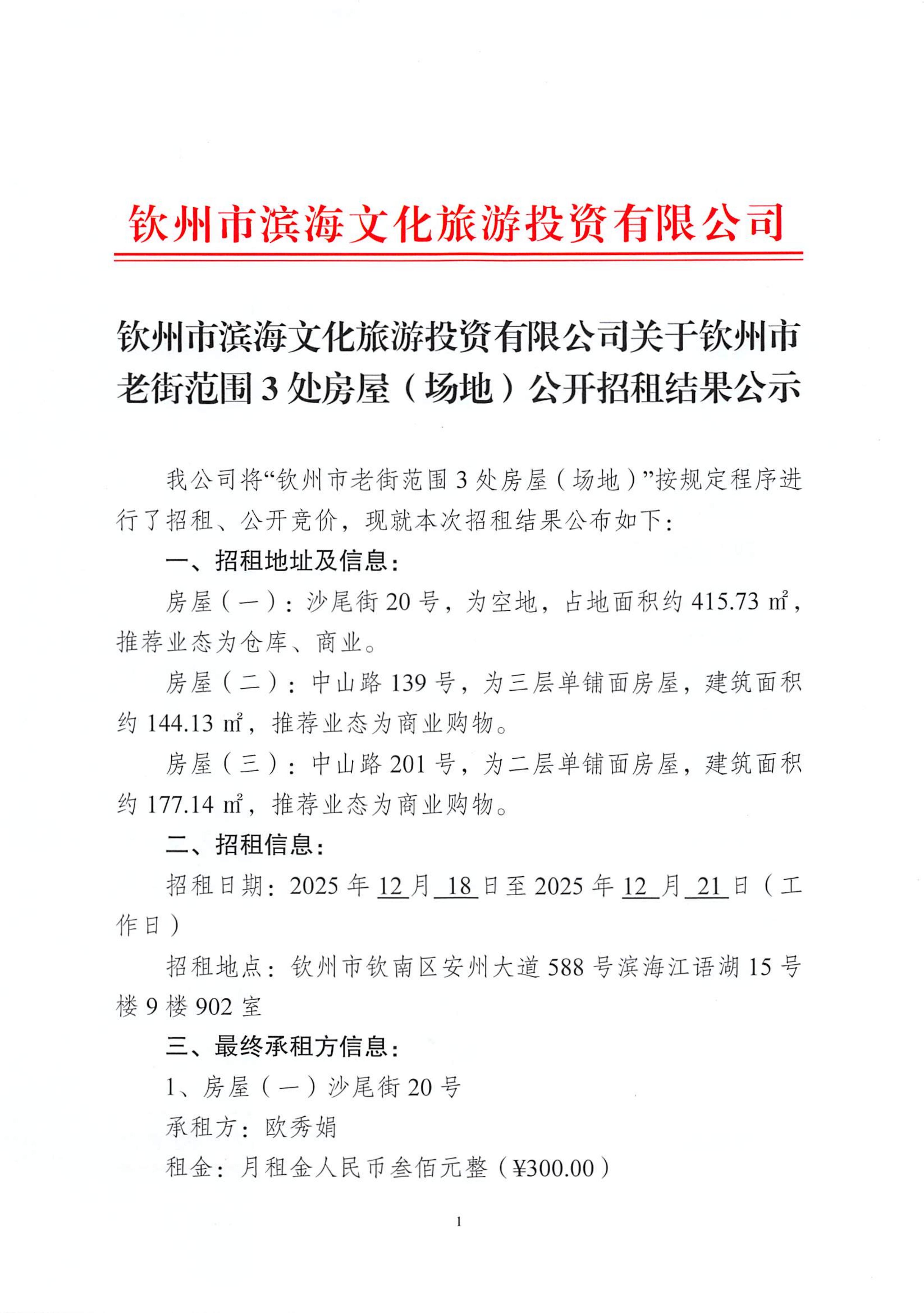 钦州市滨海文化旅游投资有限公司关于钦州市老街范围3处房屋(场地)公开招租结果公示(沙尾街20号、中山路139号、中山路201号)