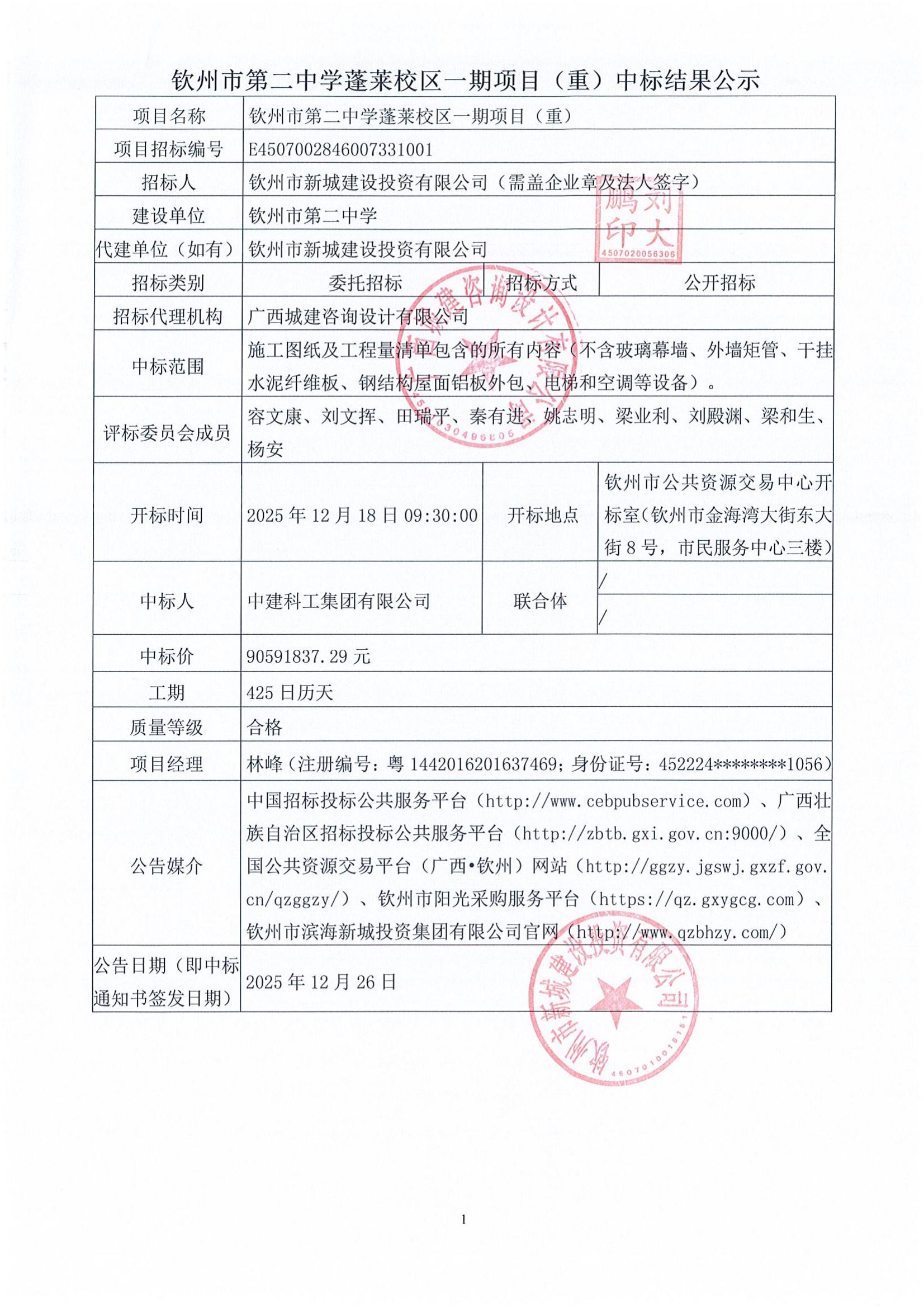 钦州市第二中学蓬莱校区一期项目(重)中标结果公示