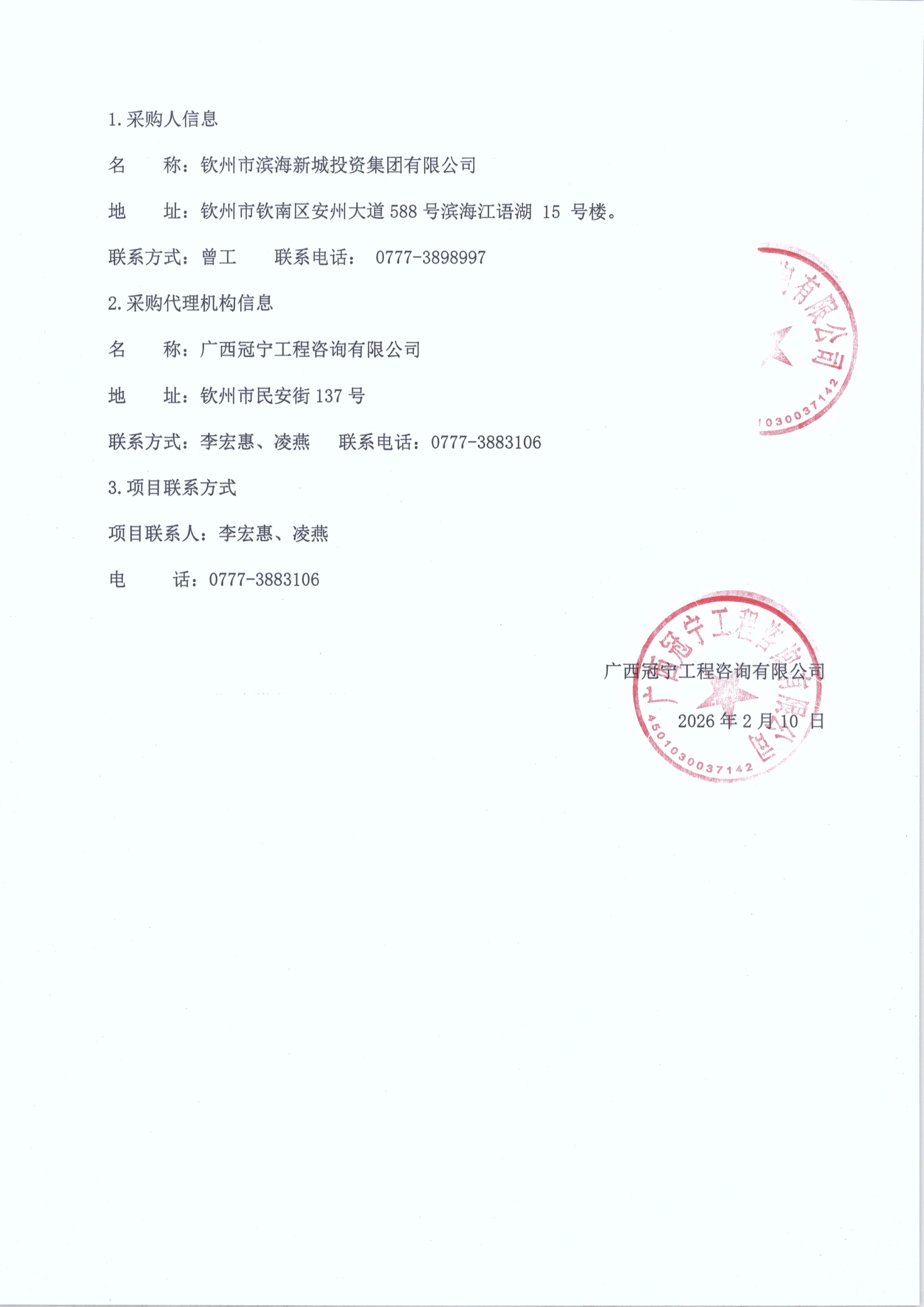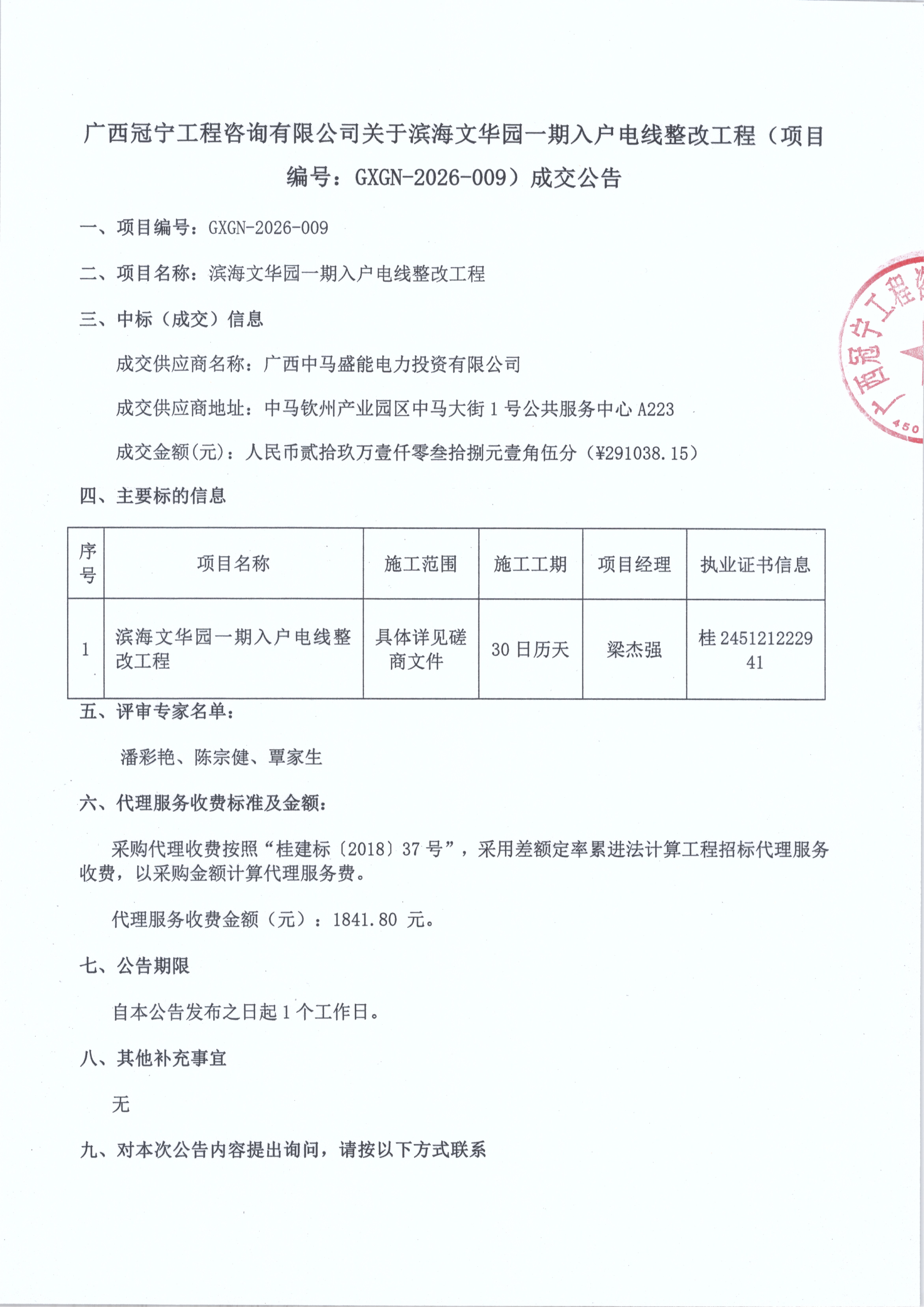 广西冠宁工程咨询有限公司关于滨海文华园一期入户电线整改工程(项目 编号:GXGN-2026-009)成交公告