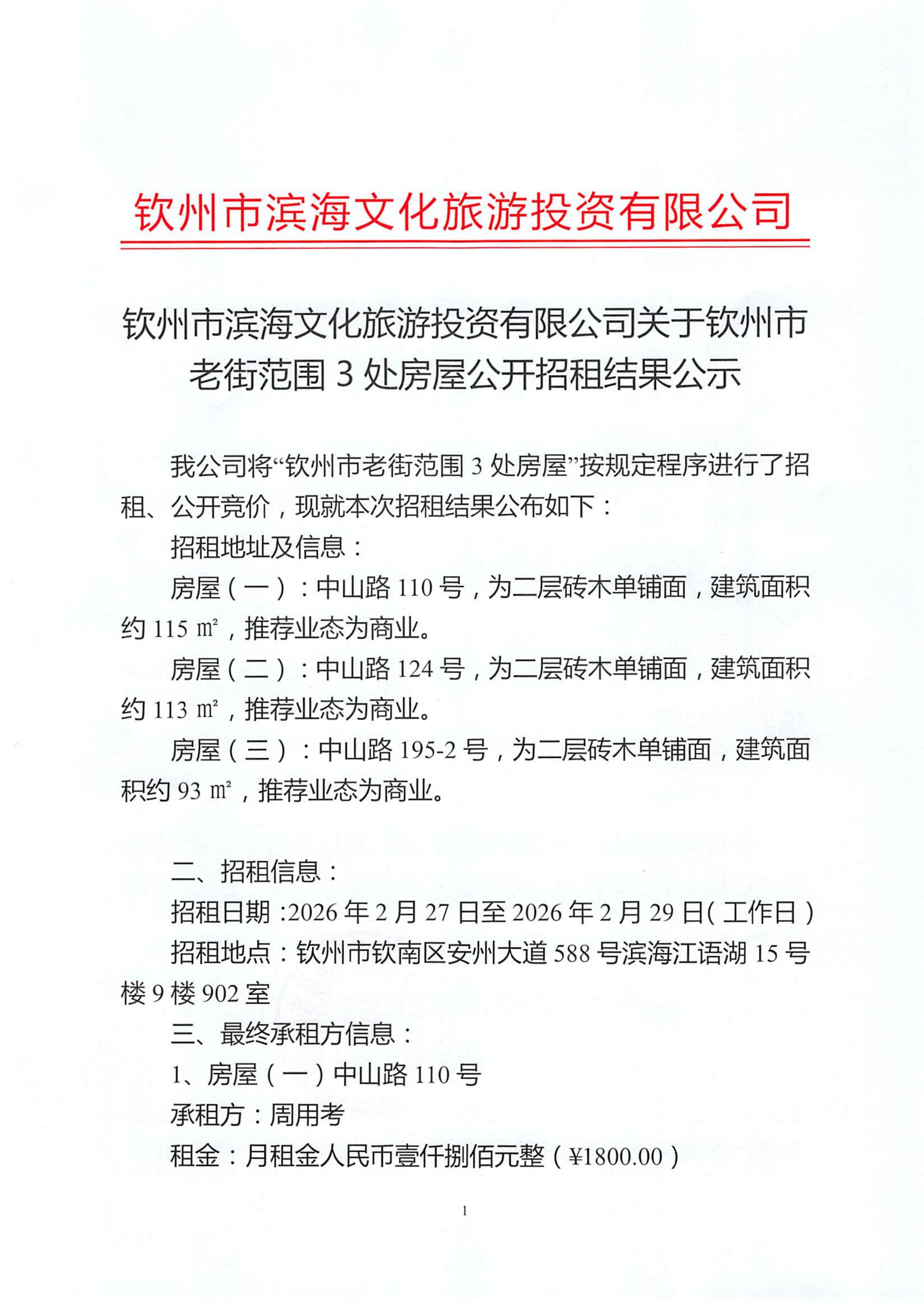 钦州市滨海文化旅游投资有限公司关于钦州市老街范围房屋公开招租结果公示(钦州市中山路183号)