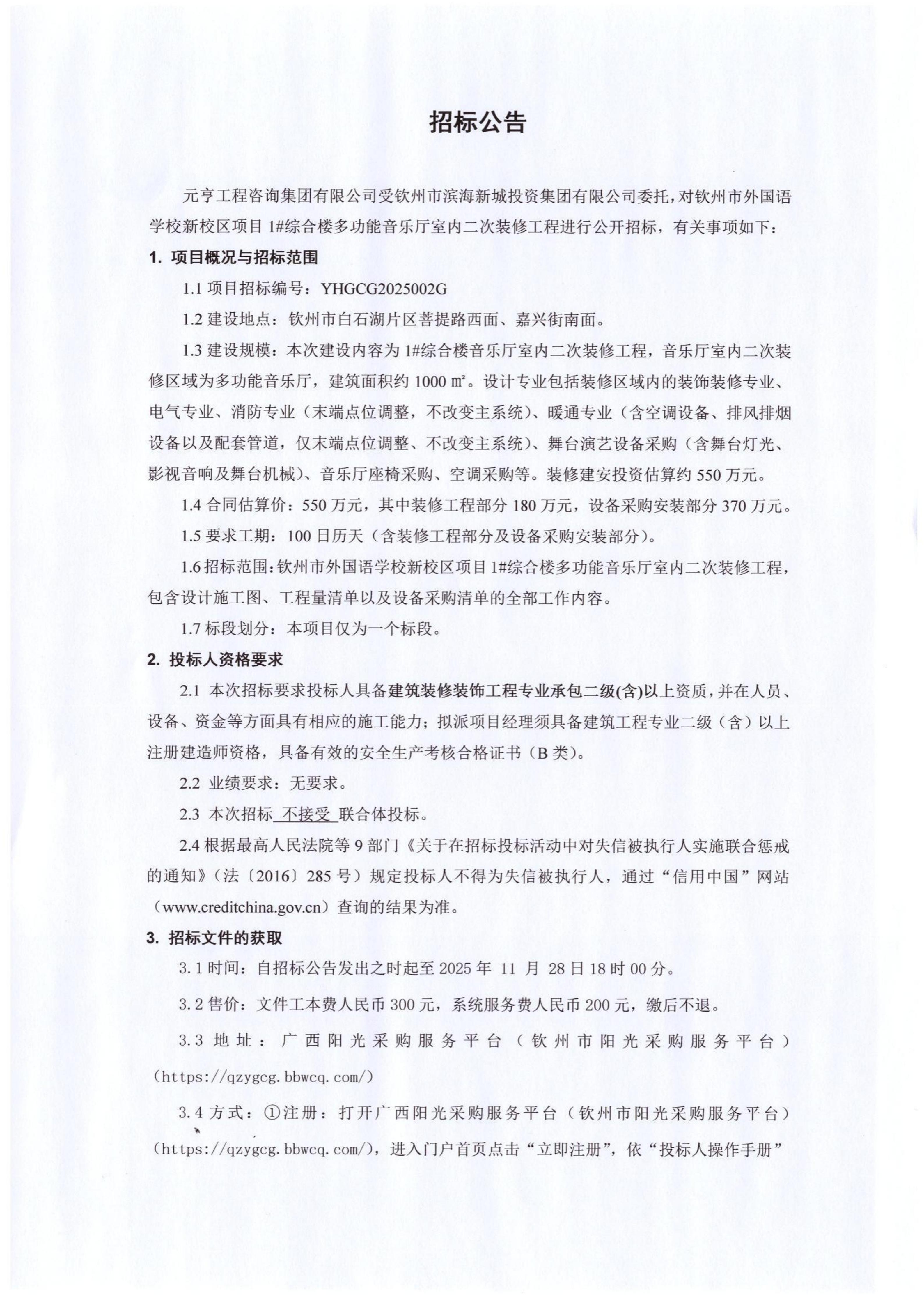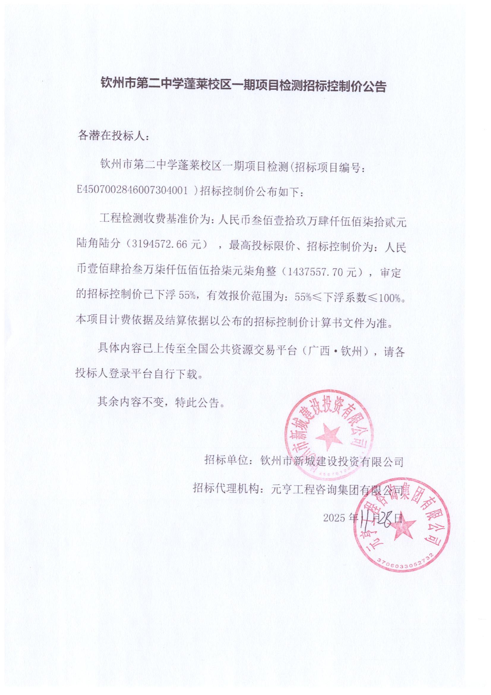 钦州市第二中学蓬莱校区一期项目检测招标控制价公告