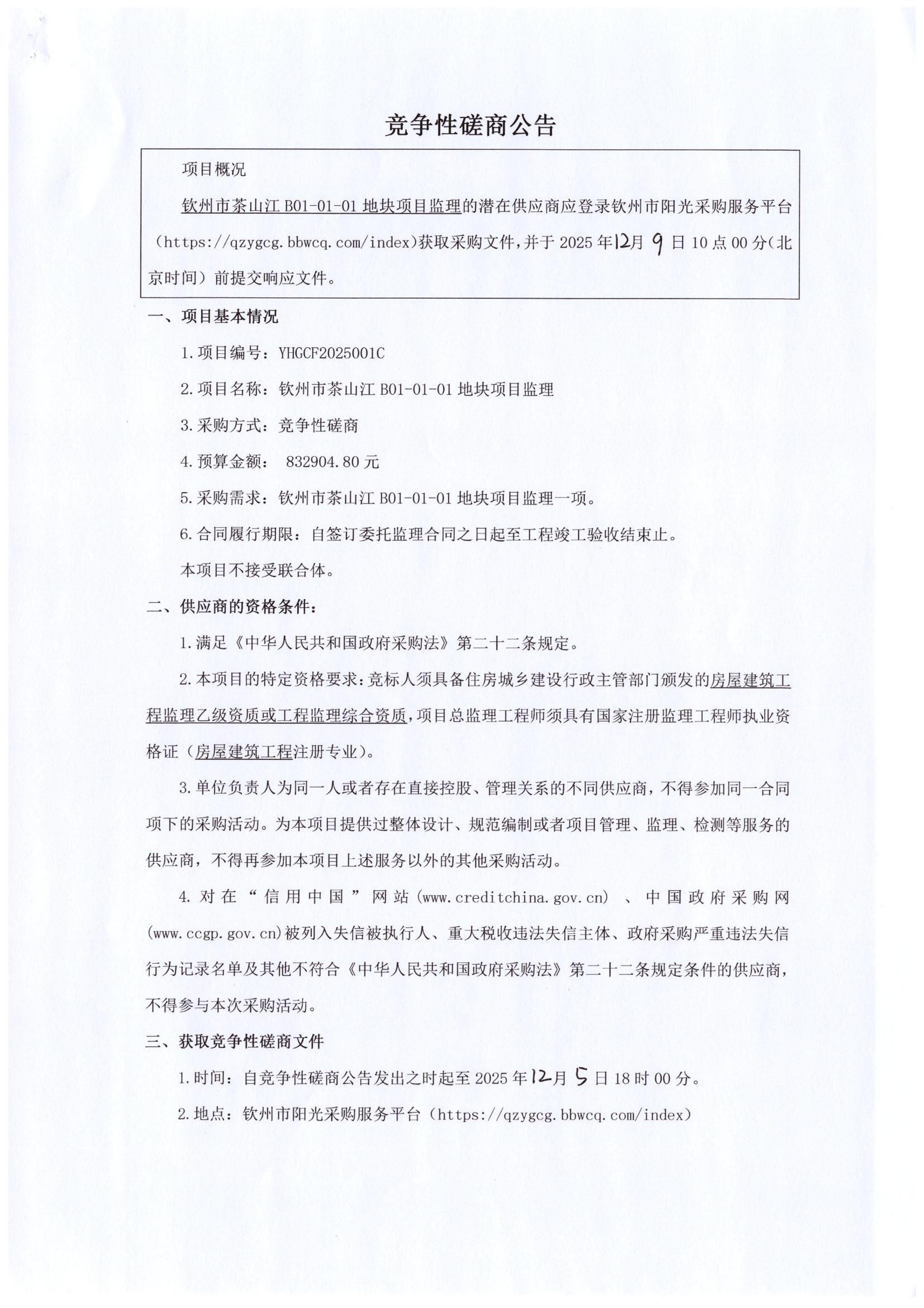 茶山江B01-01-01项目监理竞争性磋商公告