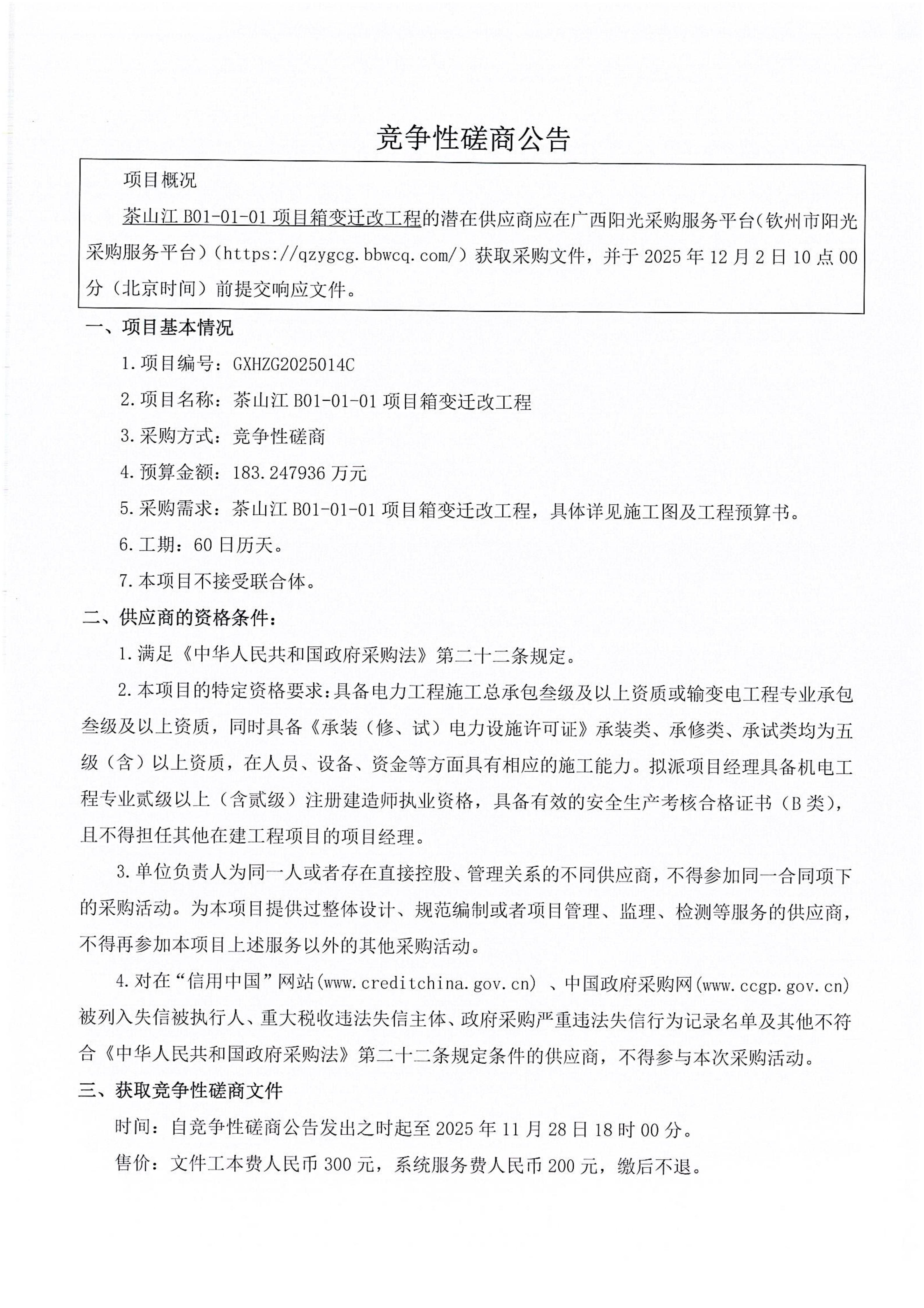 茶山江B01-01-01箱变迁改工程竞争性磋商公告