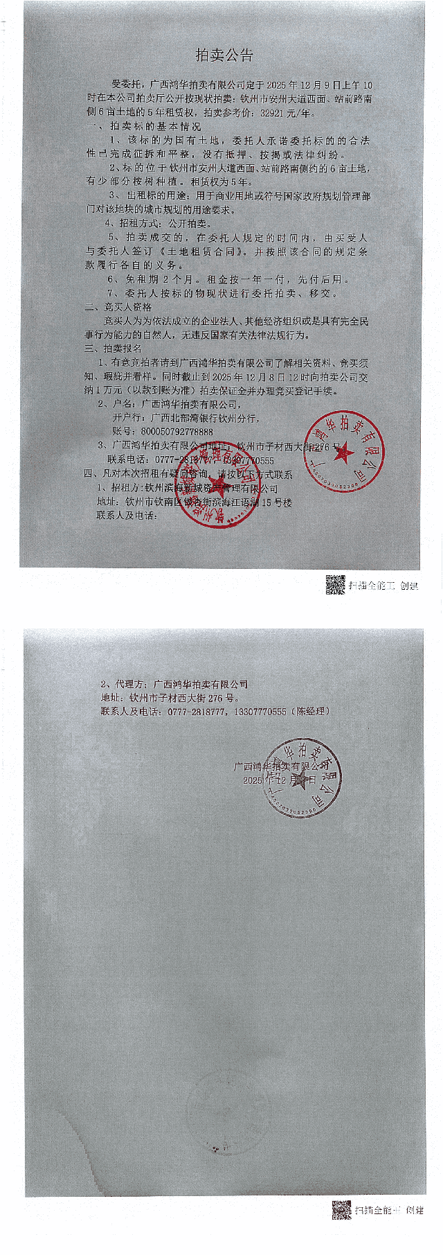 拍卖公告(钦州市安州大道西面、站前路南侧6亩土地的5年租赁权)