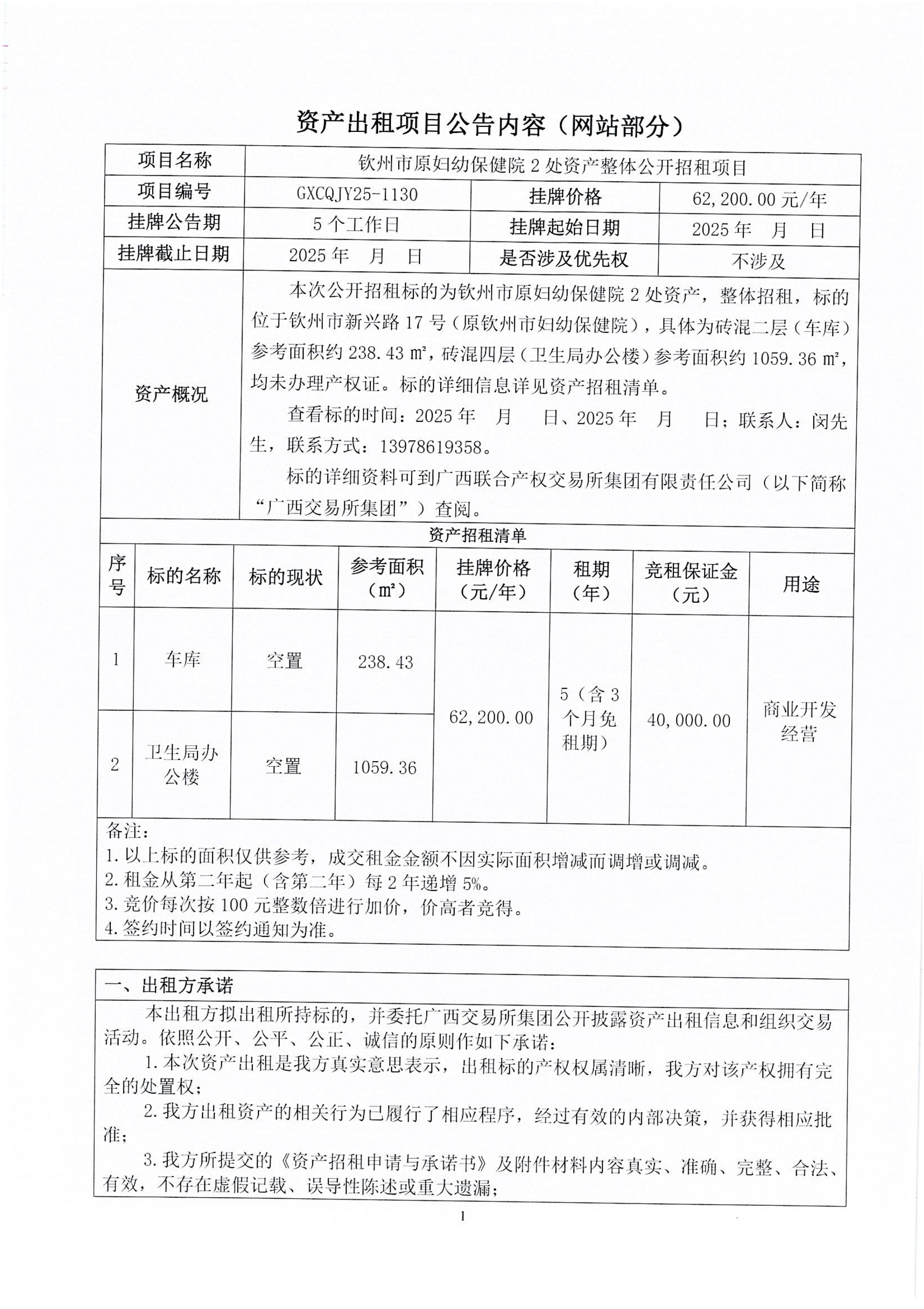 钦州市原妇幼保健院2处资产整体公开招租项目