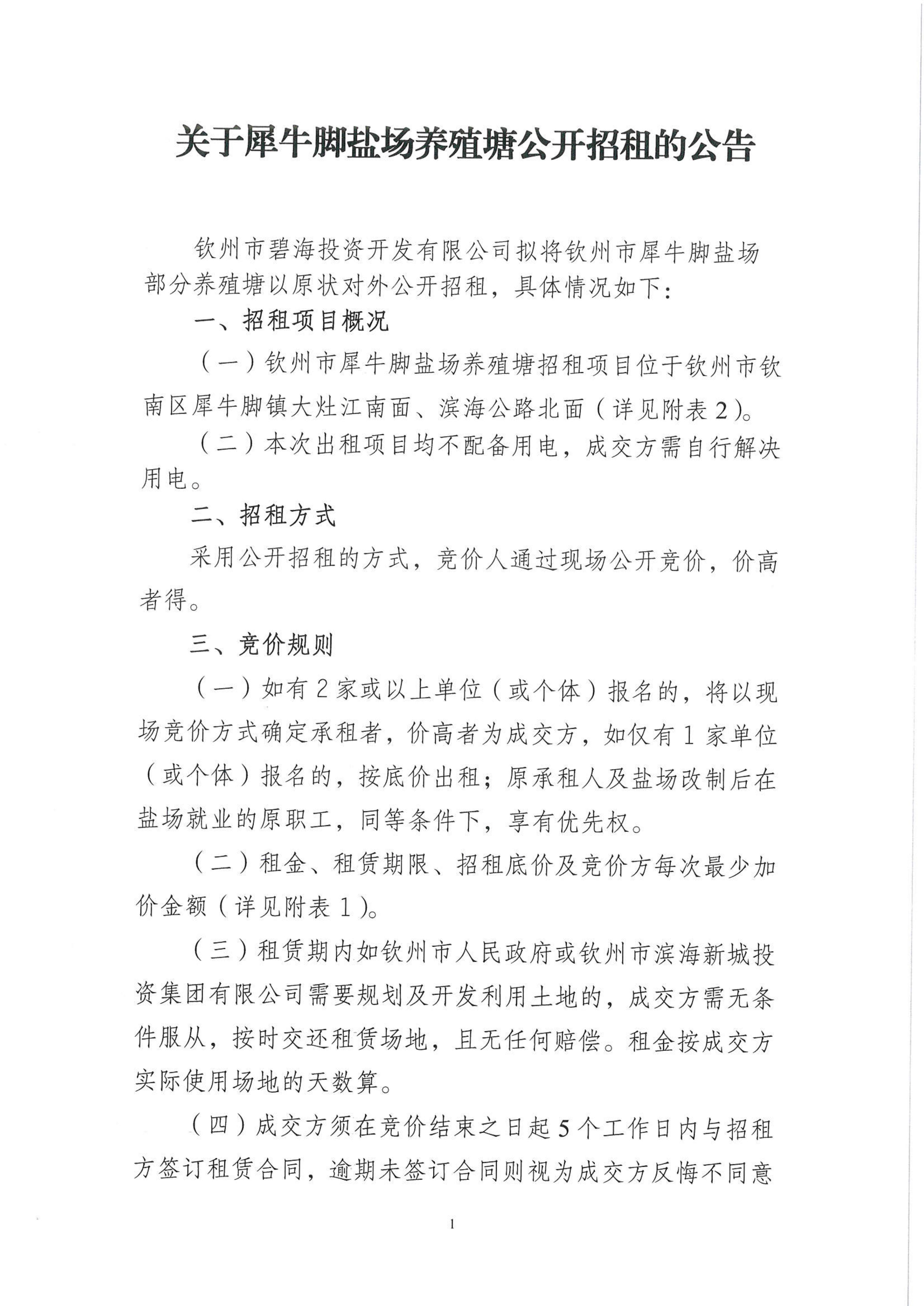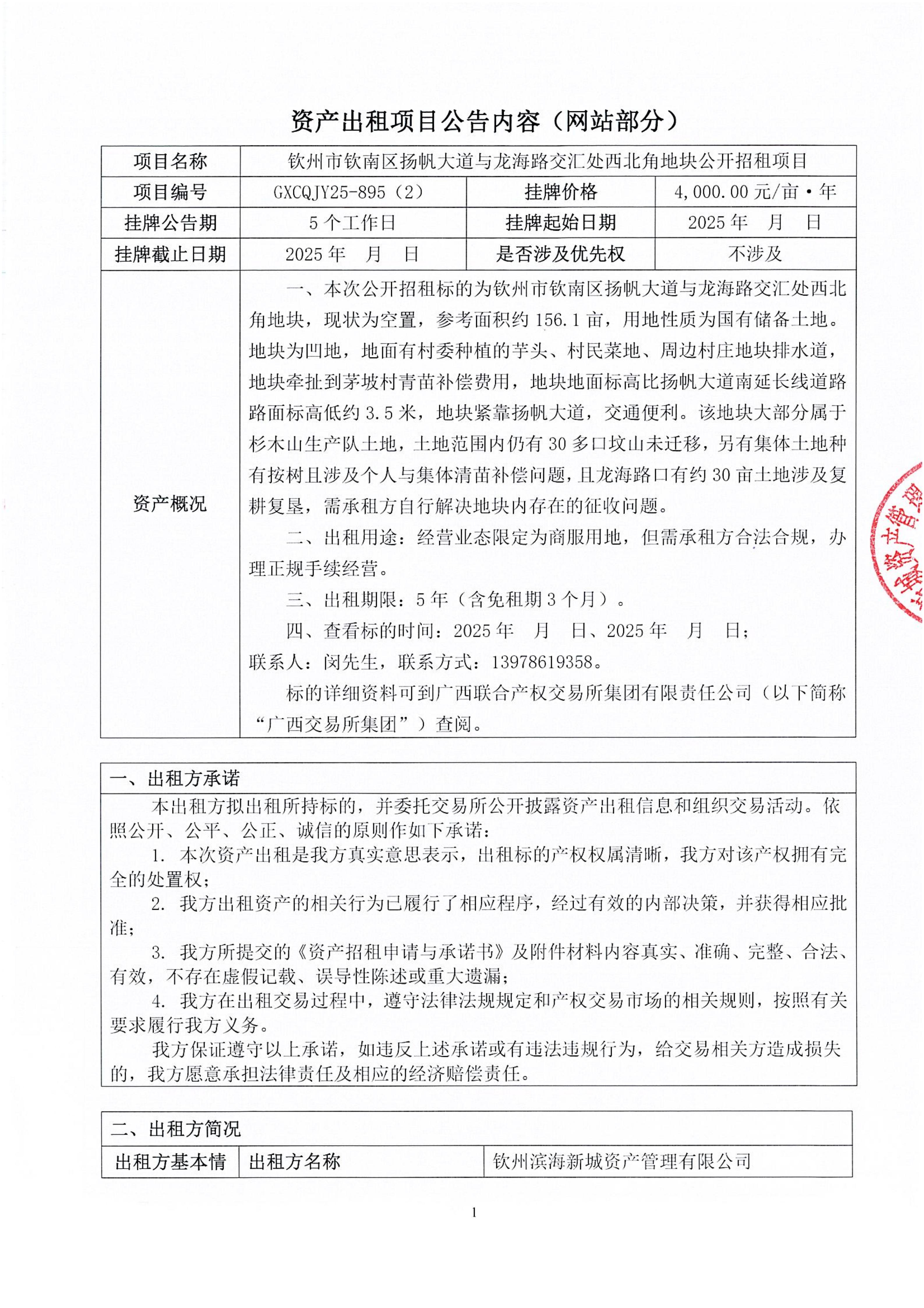 钦州市钦南区扬帆大道与龙海路交汇处西北角地块公开招租项目