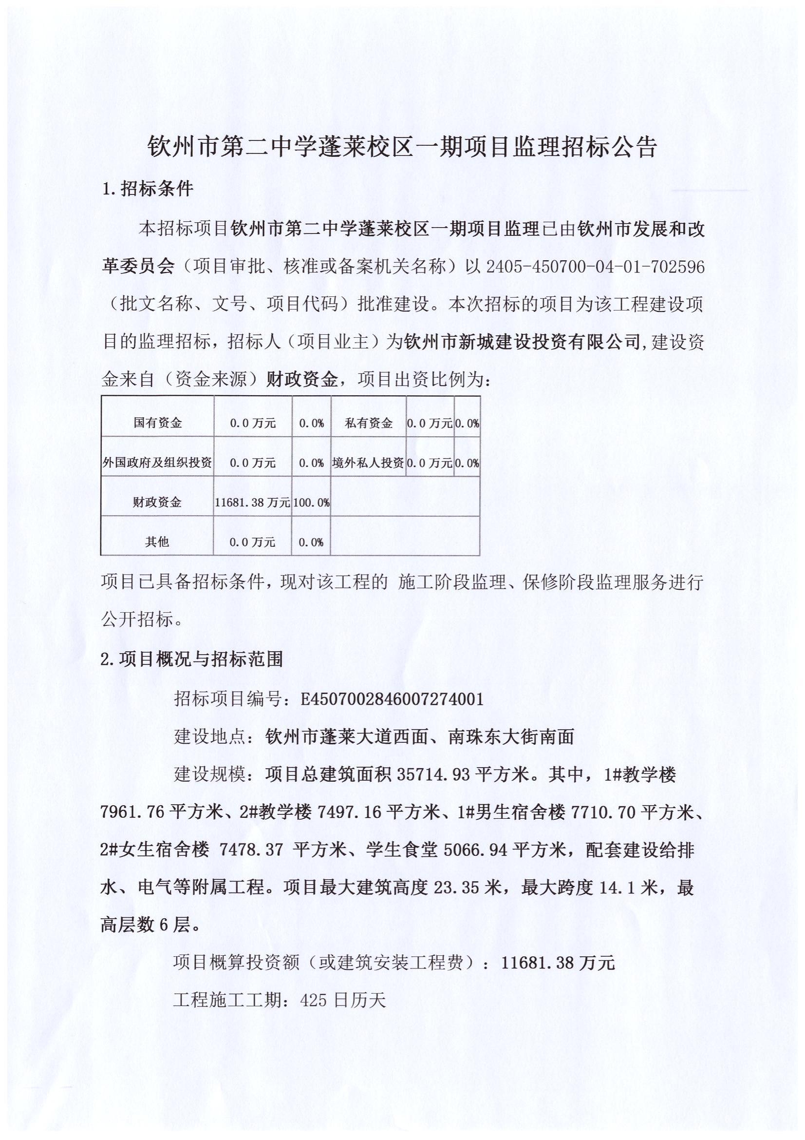 钦州市第二中学蓬莱校区一期项目监理招标公告