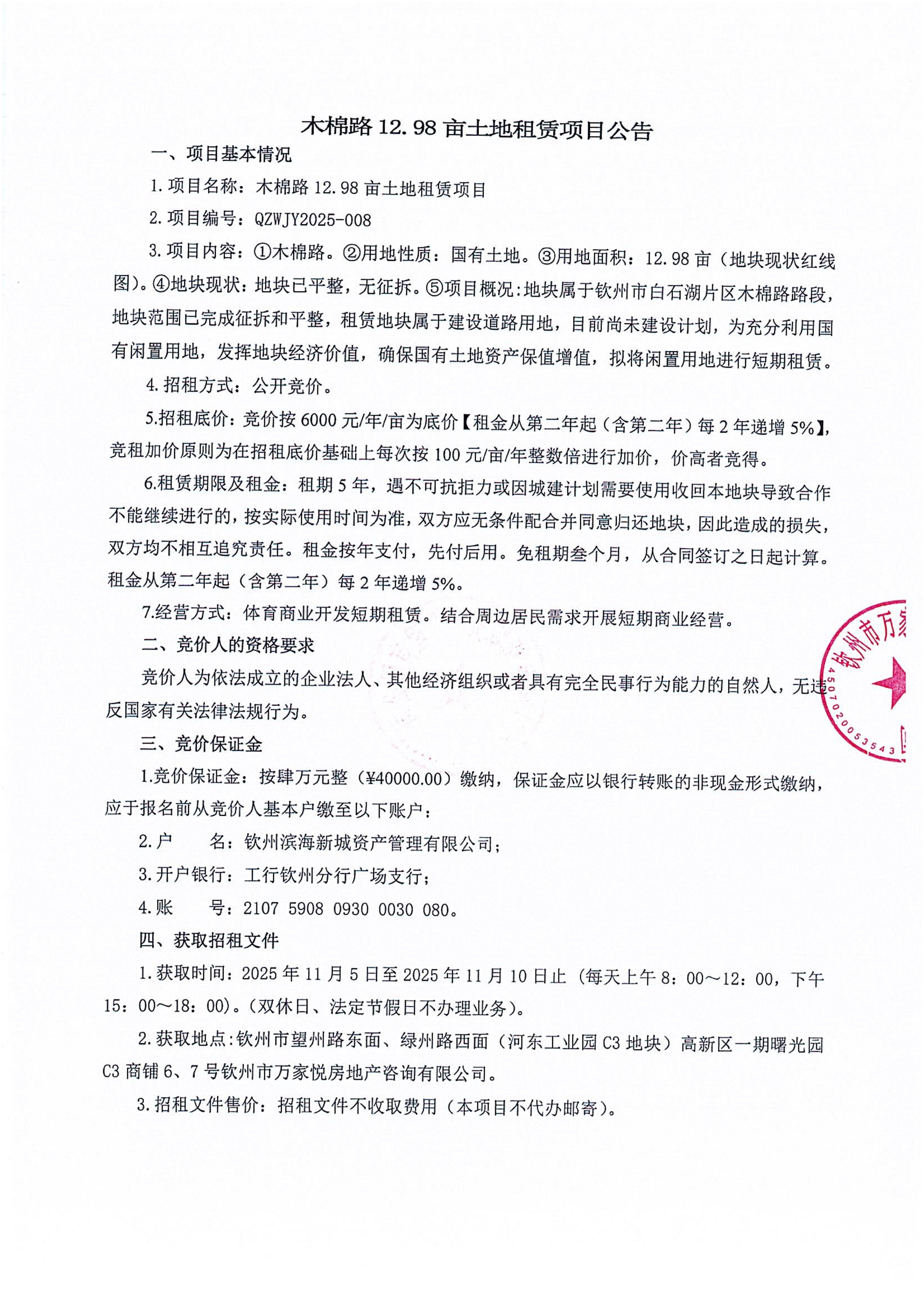 木棉路12.98亩土地租赁项目公告