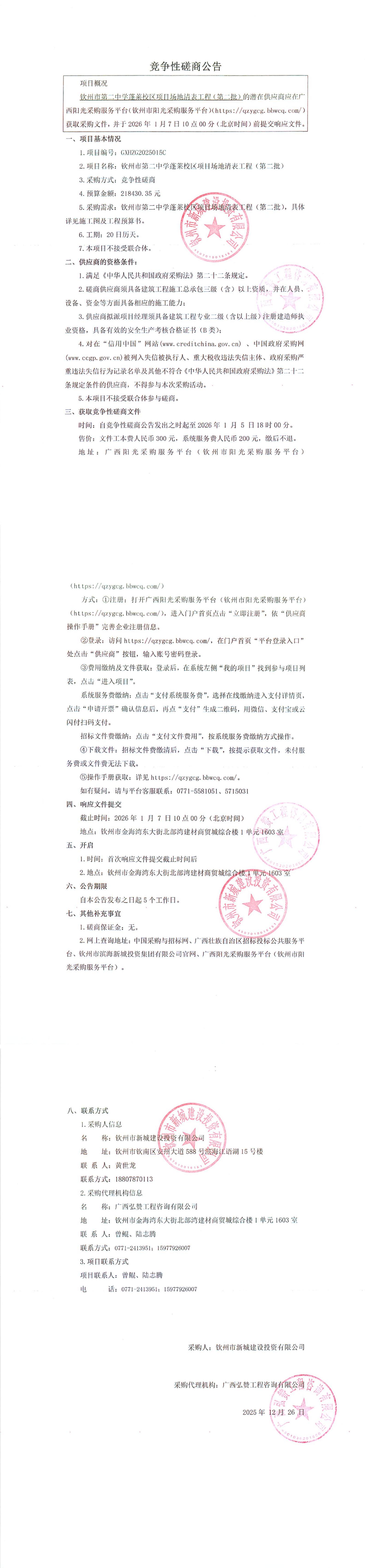 竞争性磋商公告(钦州市第二中学蓬莱校区项目场地清表工程(第二批))